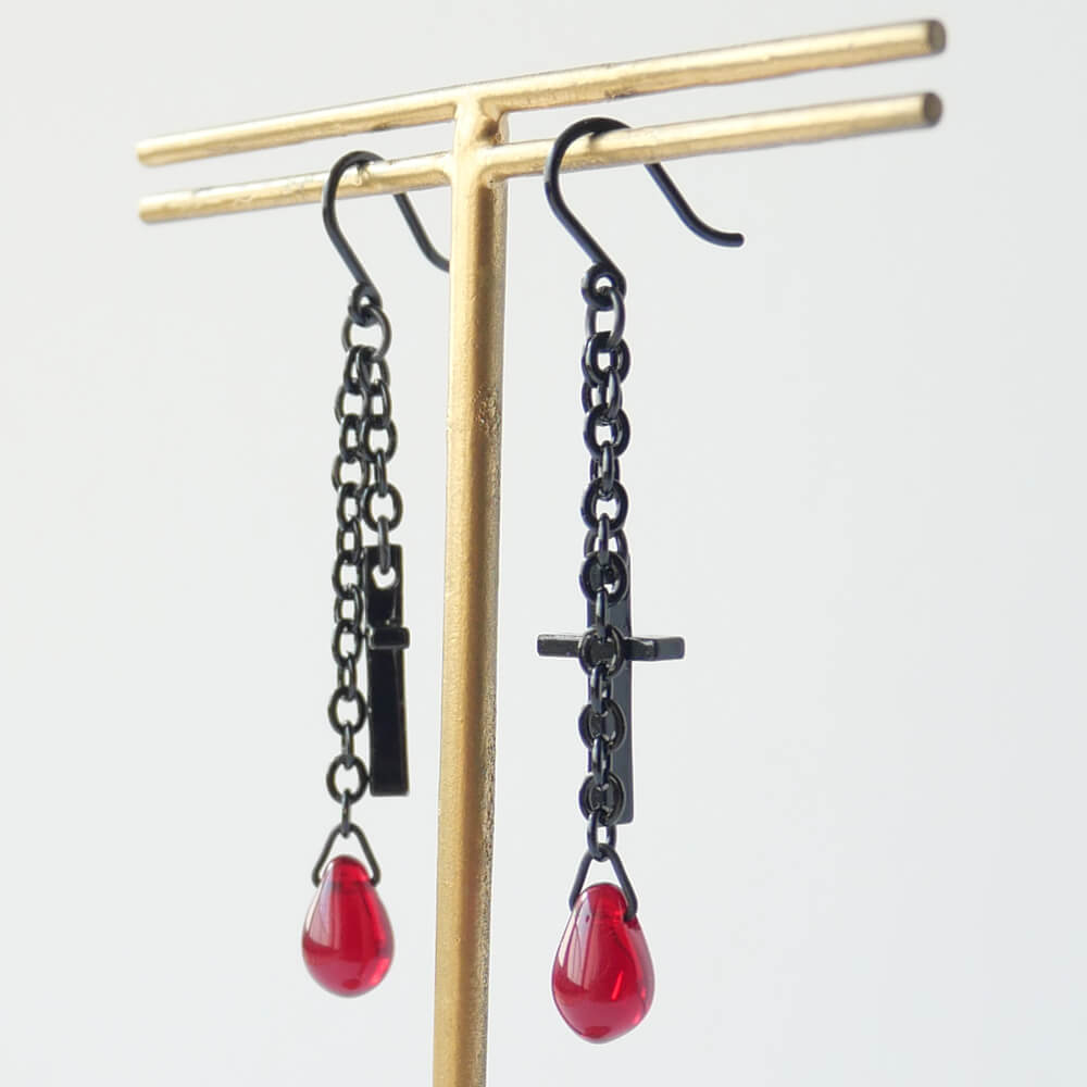 樹脂ポスト ピアス ブラック クロス レッド ドロップ 十字架