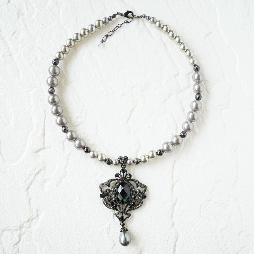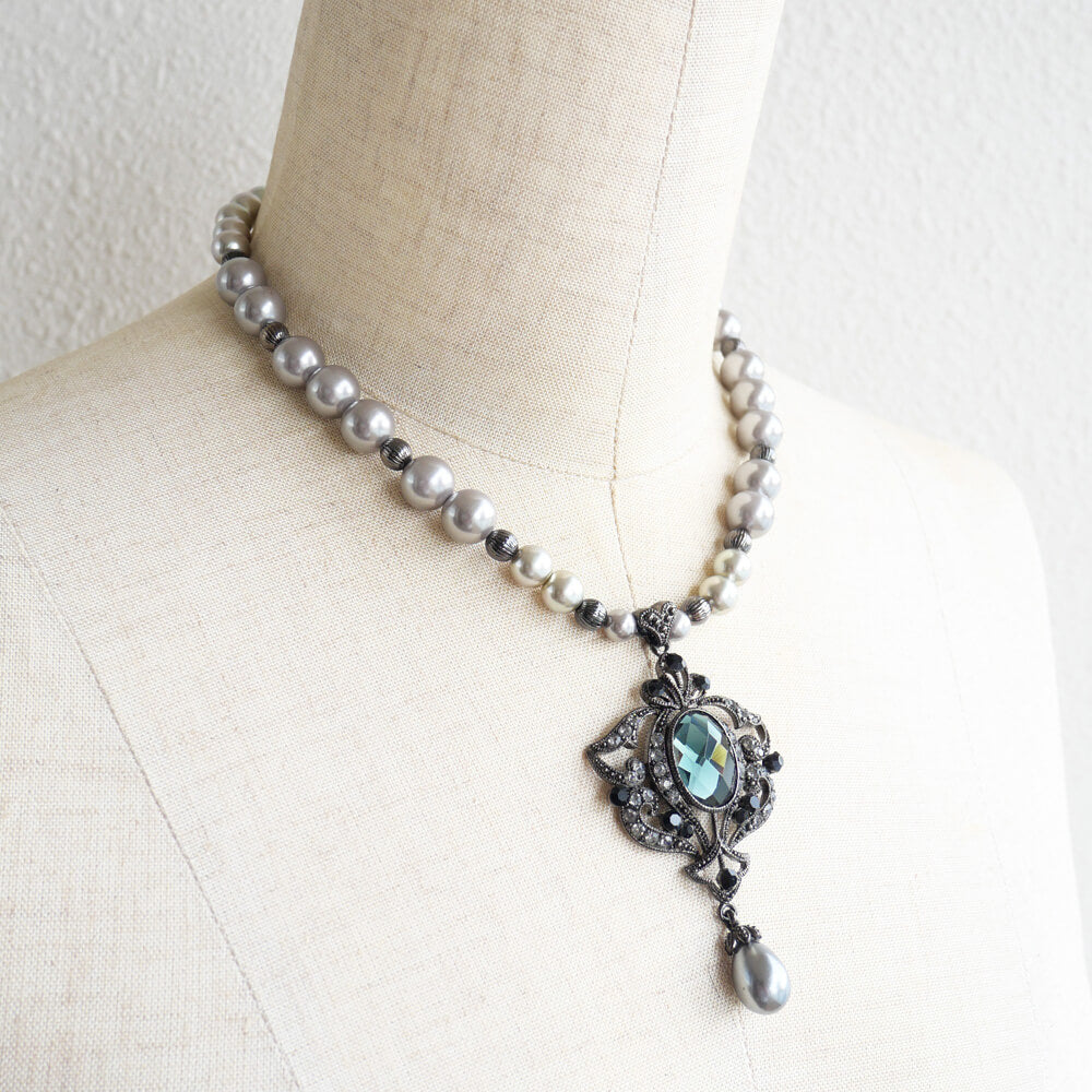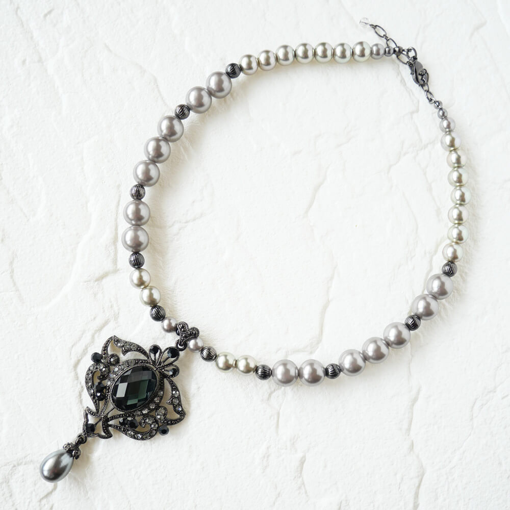 ビンテージ感を醸し出すこのネックレスは、特別なパーティシーンやイベント、非日常の装いにも品格を添え、長く愛用できるデザインが魅力です。
