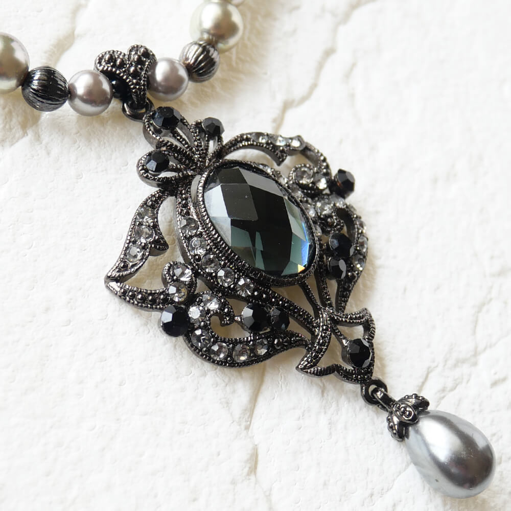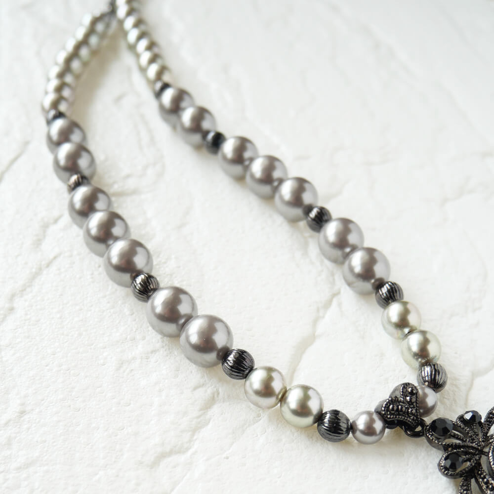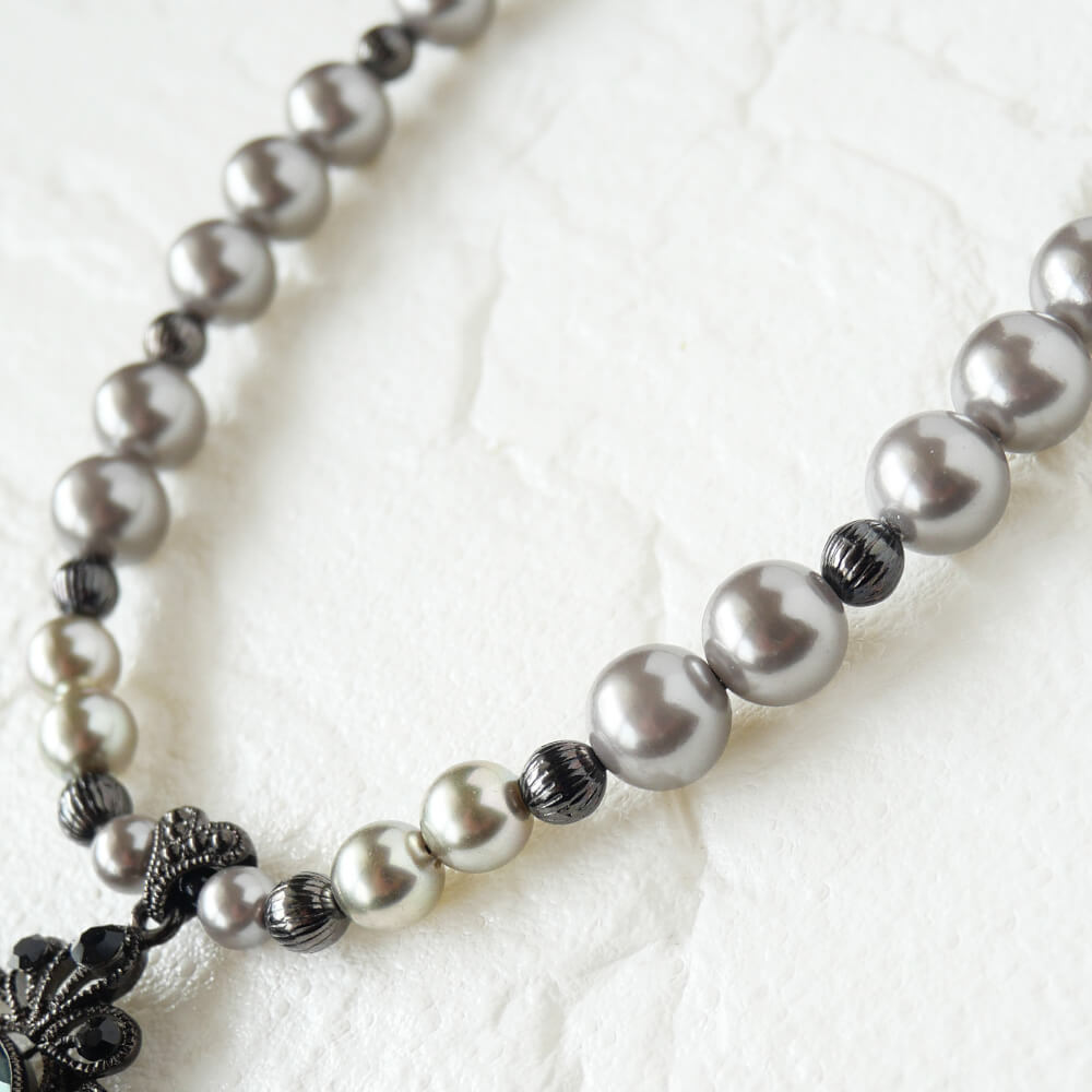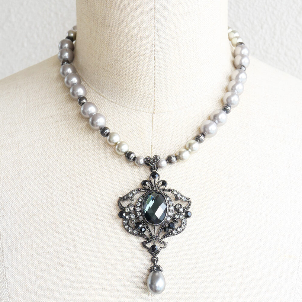 ビンテージ感を醸し出すこのネックレスは、特別なパーティシーンやイベント、非日常の装いにも品格を添え、長く愛用できるデザインが魅力です。