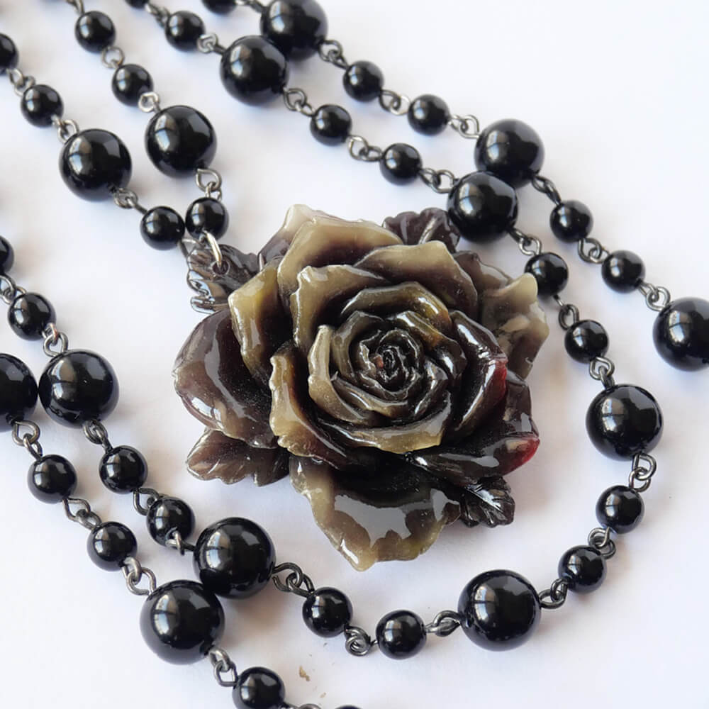 黒薔薇 ゴシック ブラック 3連ネックレスは、2000年代の樹脂製薔薇をヘッドに使用した独特のデザインが特徴。