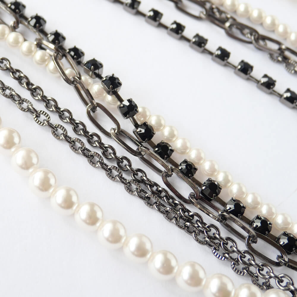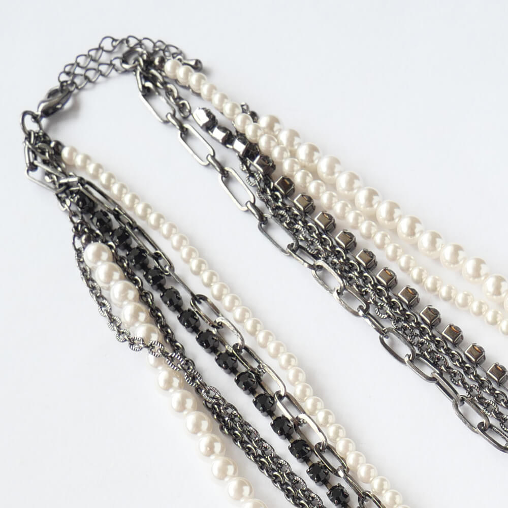 ブラックラインストーンチェーンと2本のパールの6連ネックレスの