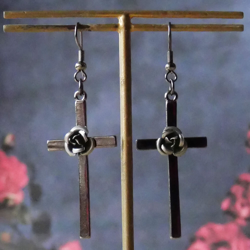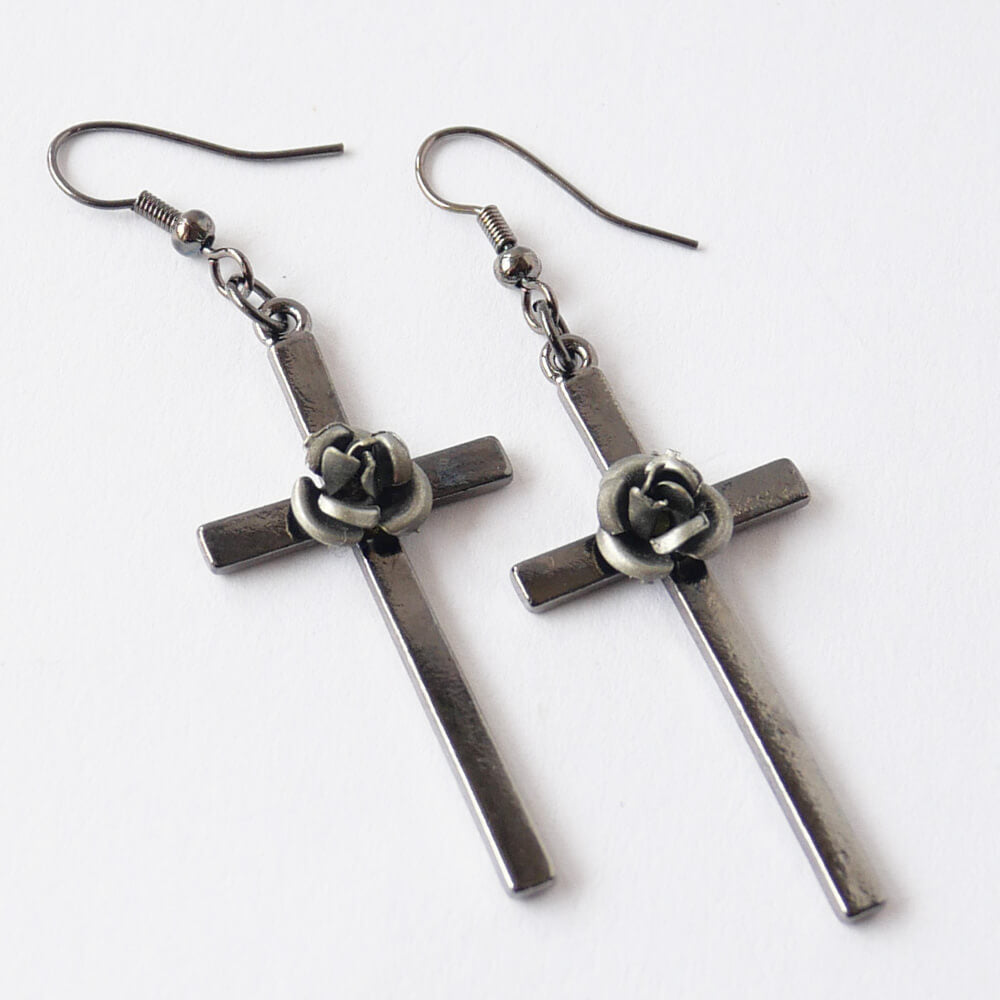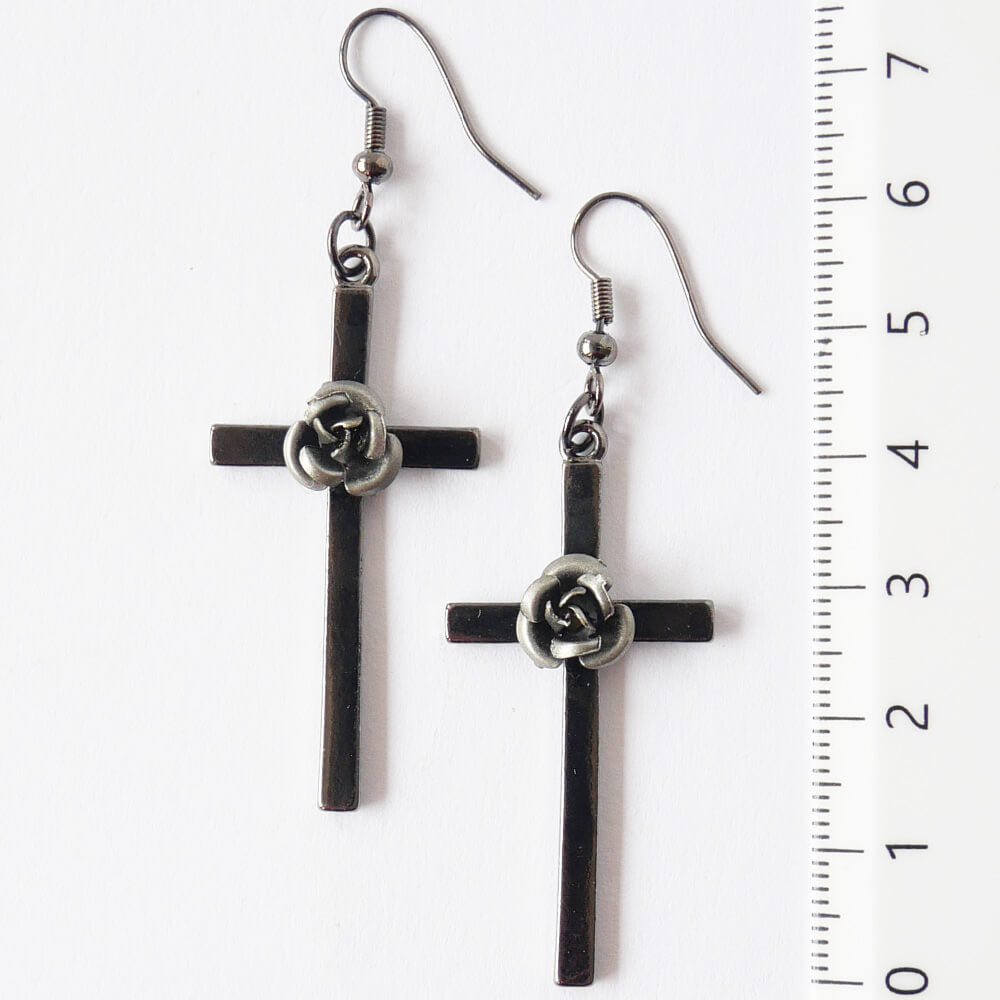 ゴスロリ ピアス ビンテージ風 薔薇十字架 ガンメタ ローズ クロス
