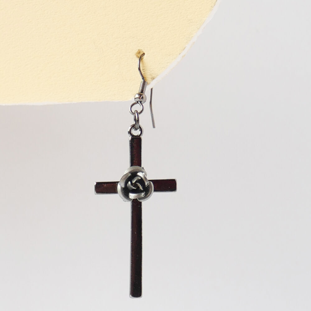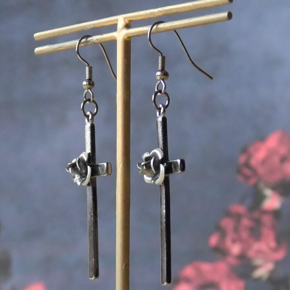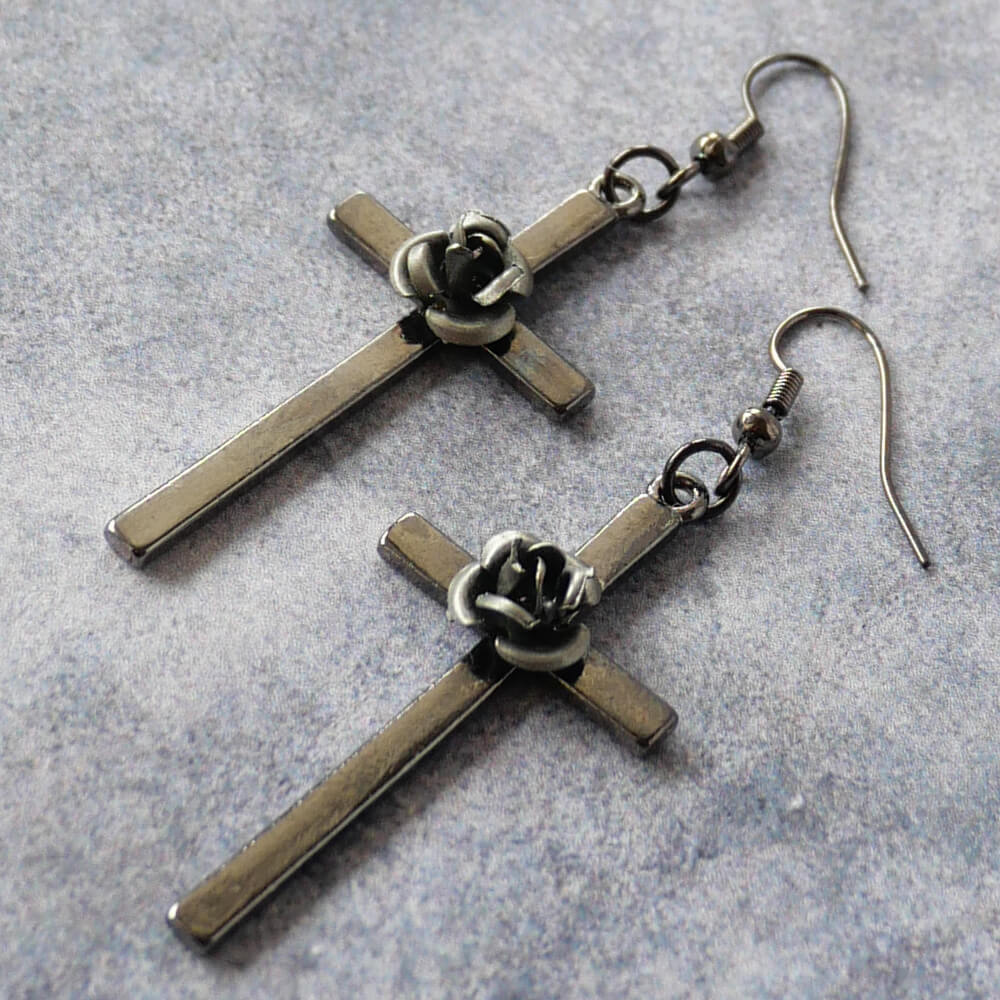 ガンメタ ローズ クロス ピアスは、2000年当時のビンテージ風デザインを再現したゴシック的なアクセサリーです。