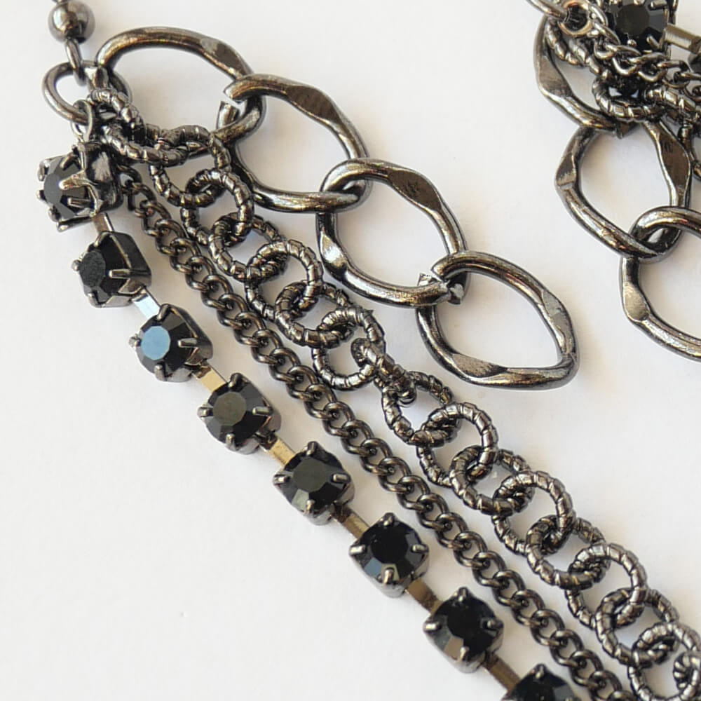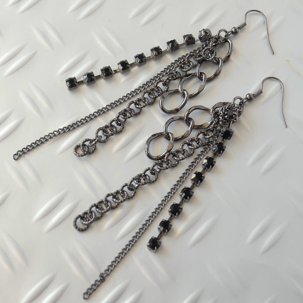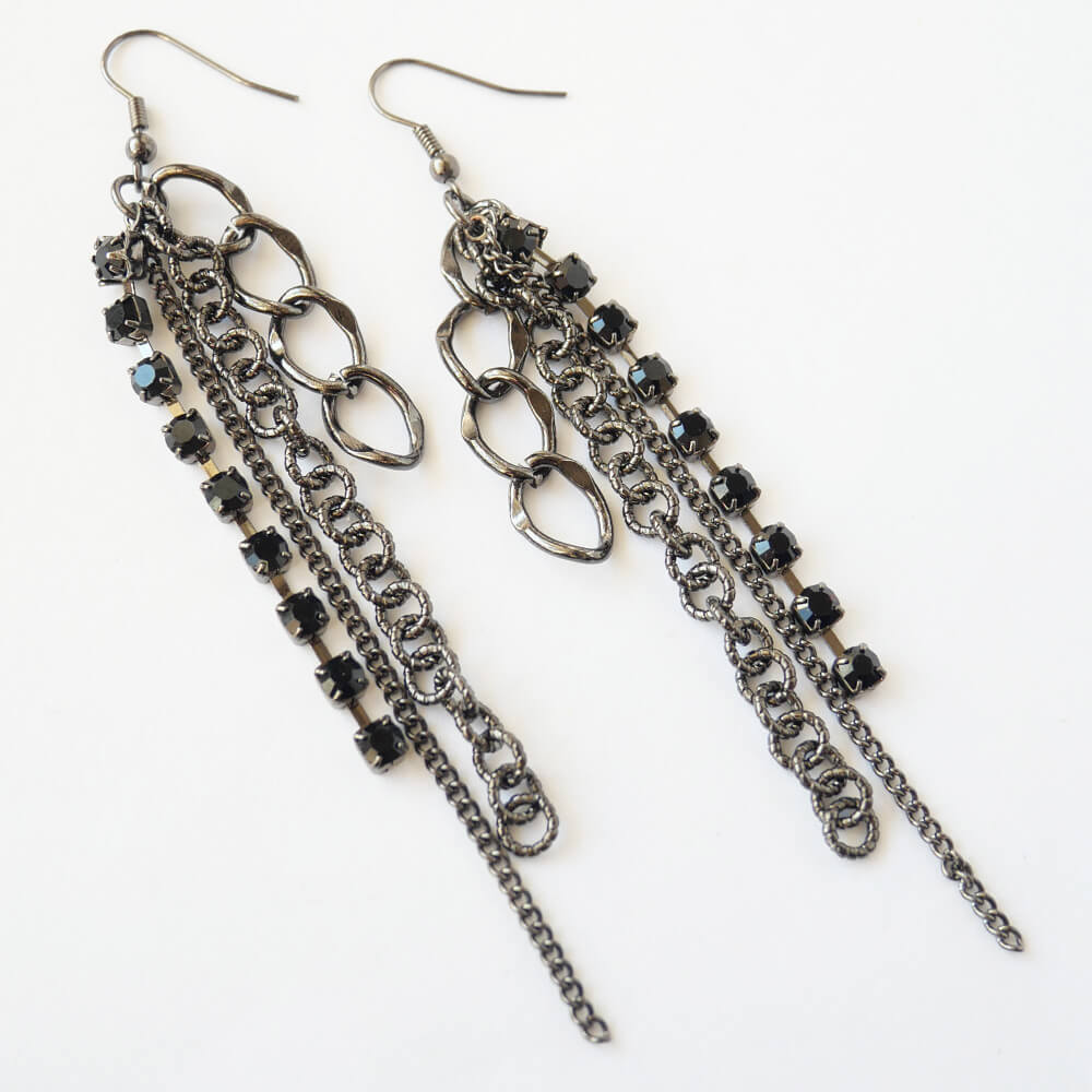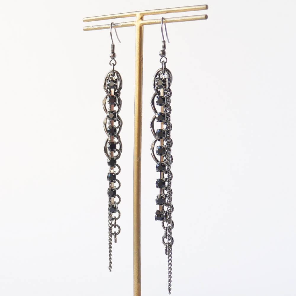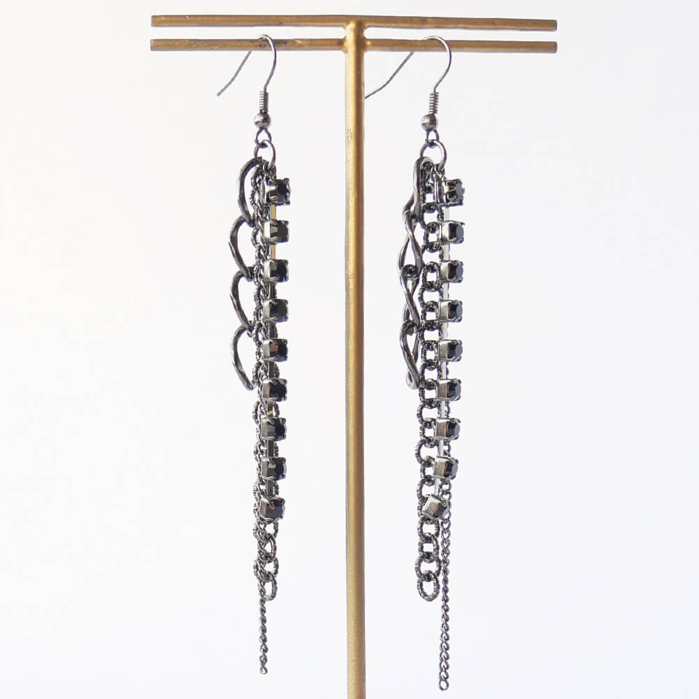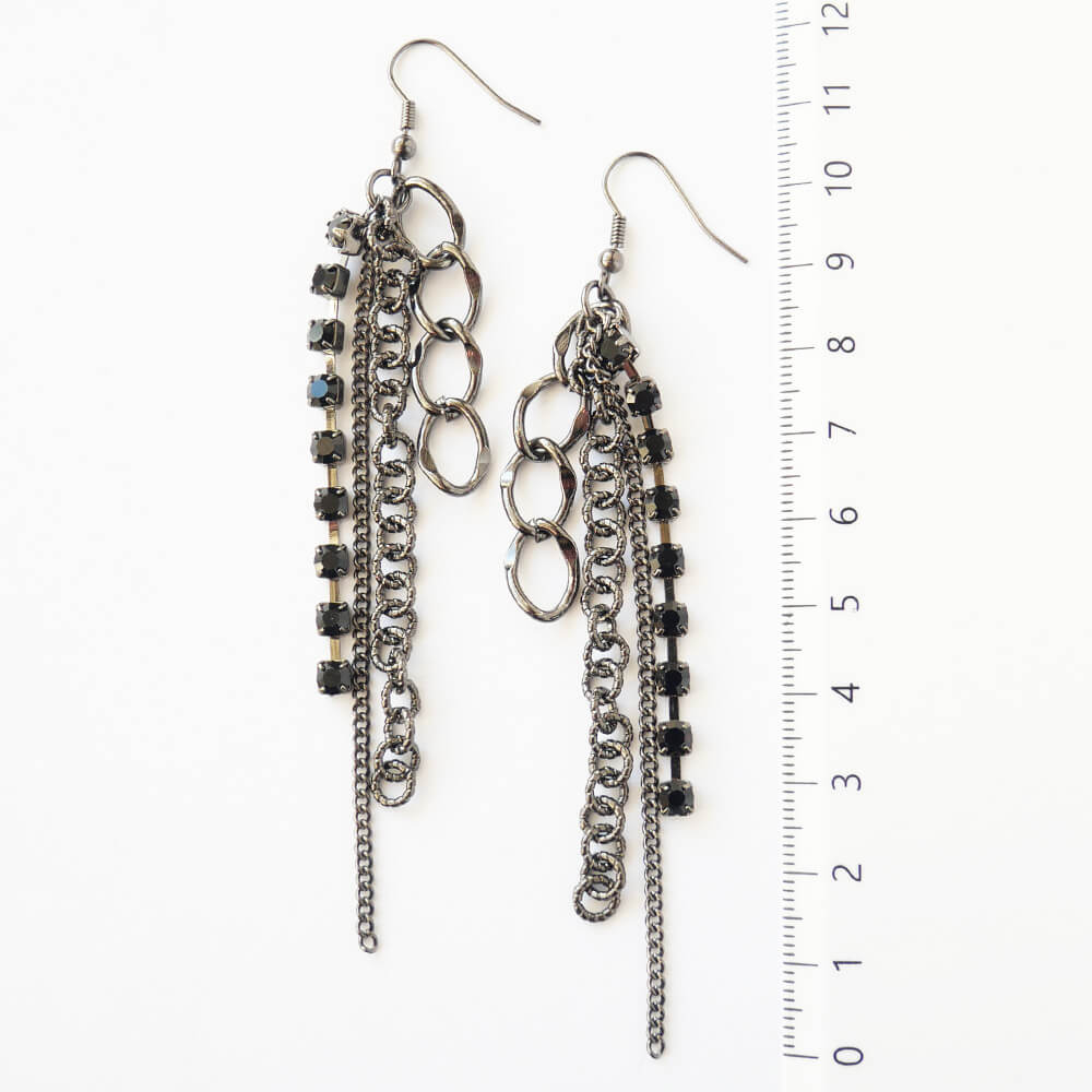 ブラックラインストーン ピアス ガンメタチェーン ロング