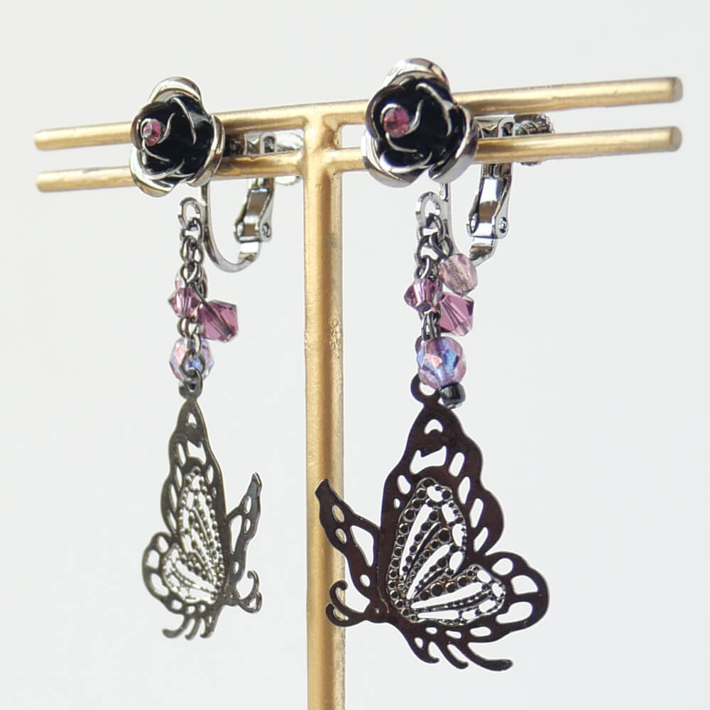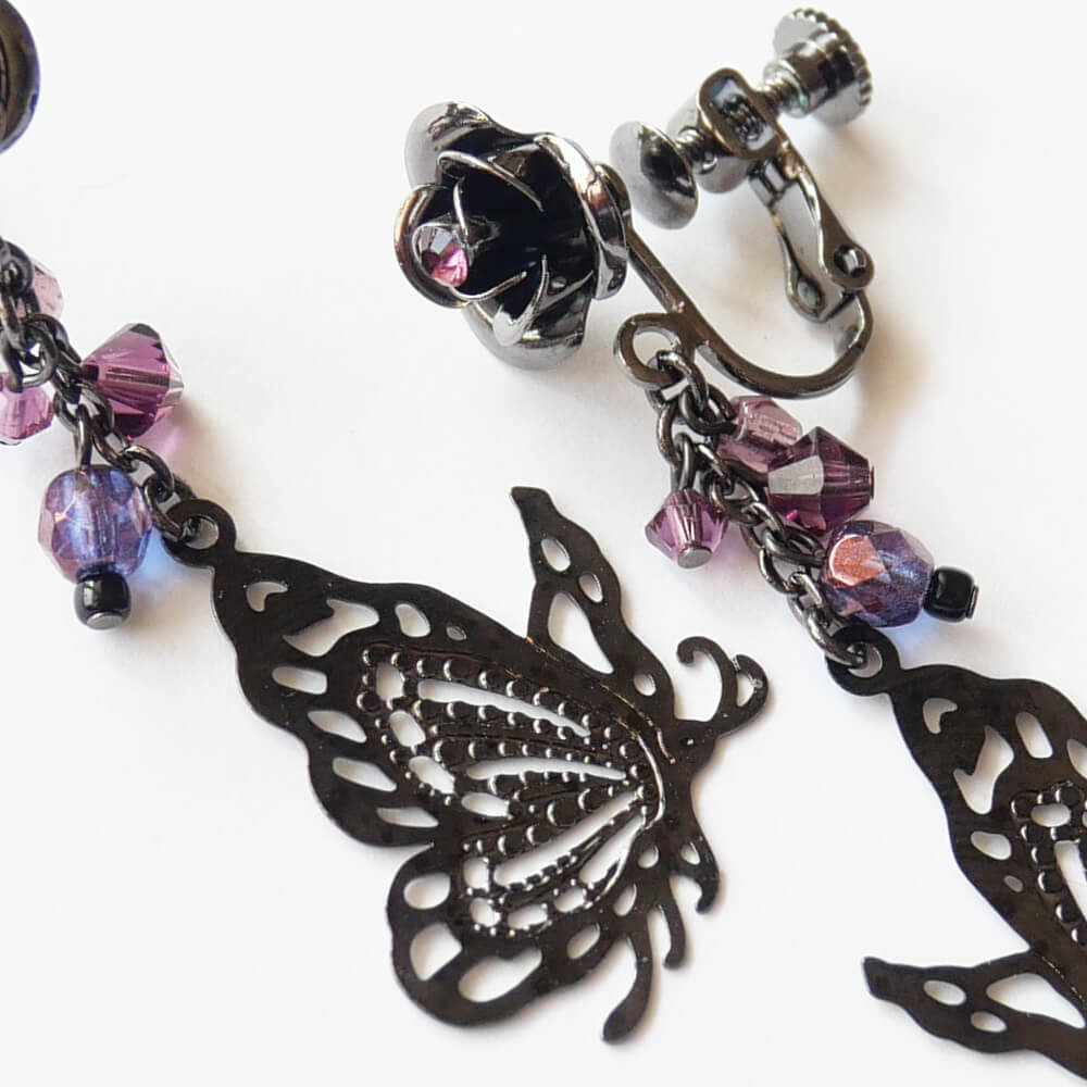 パープルローズ×ガンメタバタフライのゴスロリ風イヤリング