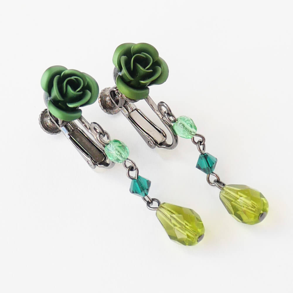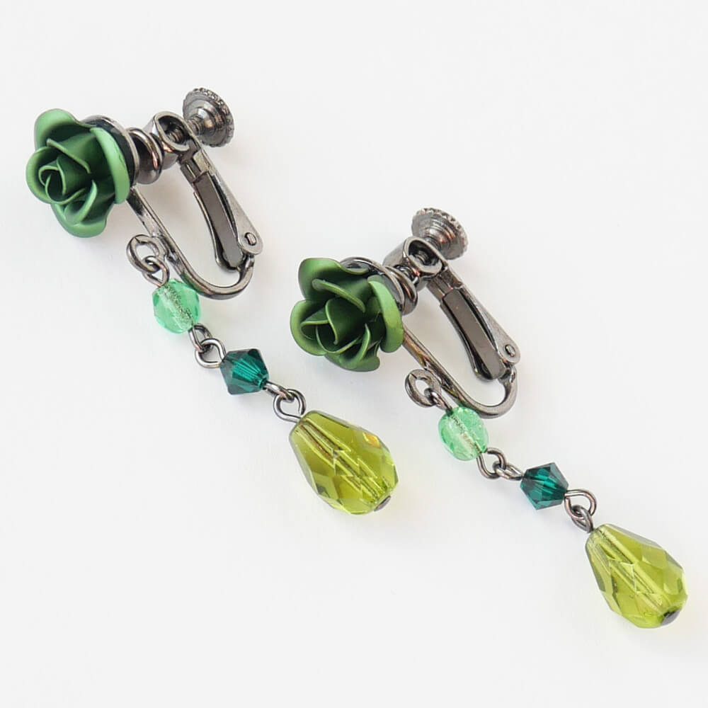 普段使いでもOKのグリーン×ガンメタの薔薇イヤリングです。