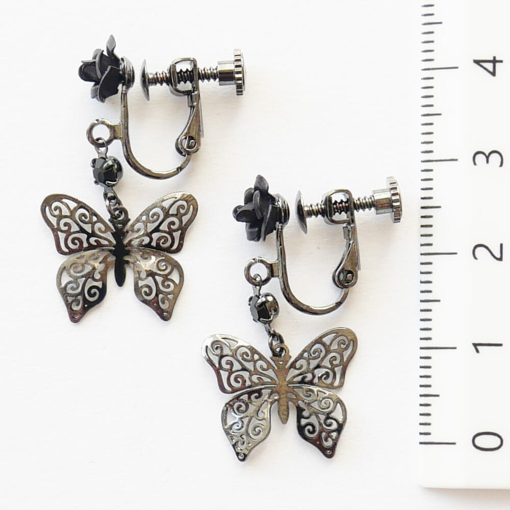繊細なステンド蝶のミニパーツが美しく、控えめなゴスロリテイストを楽しむことができるイヤリングです。