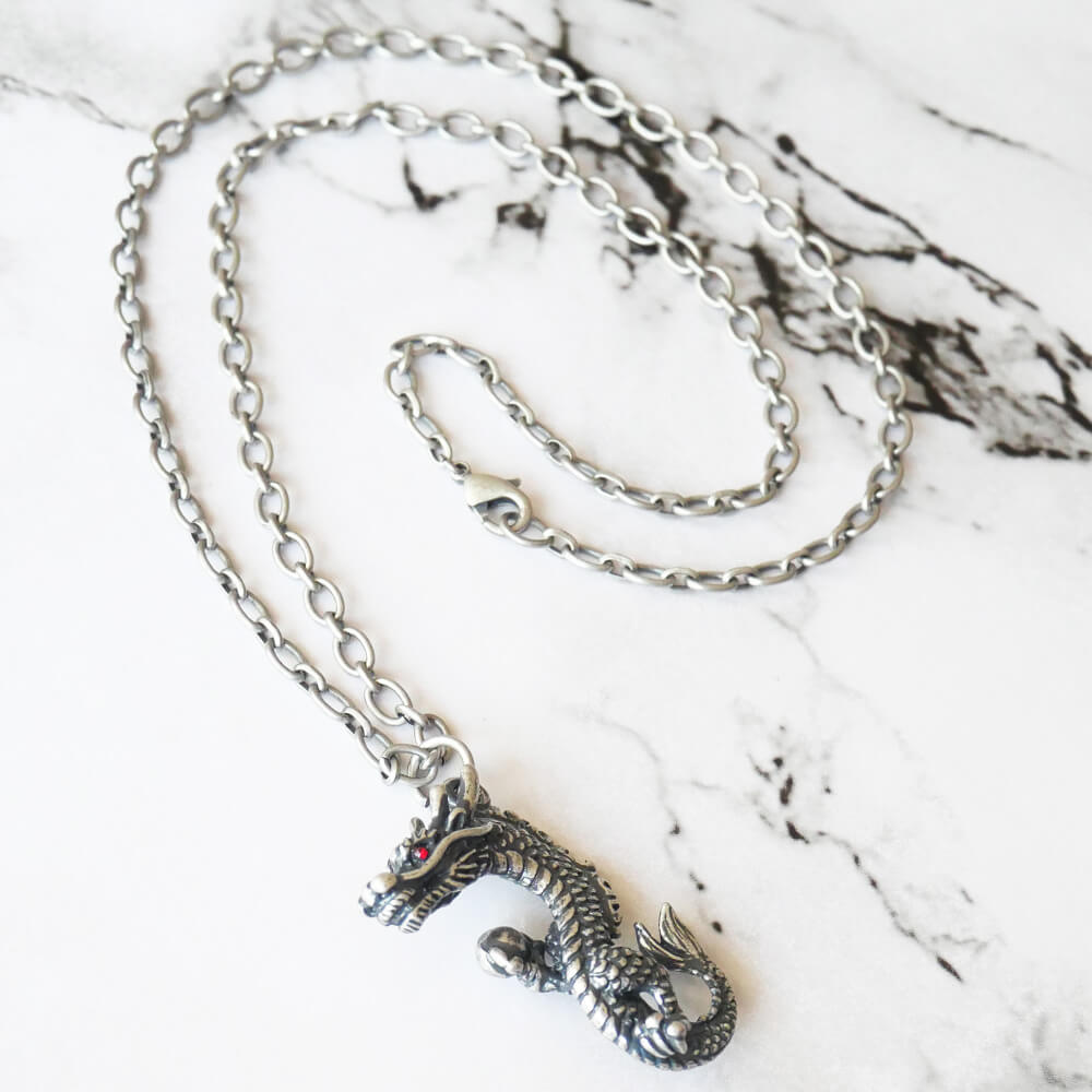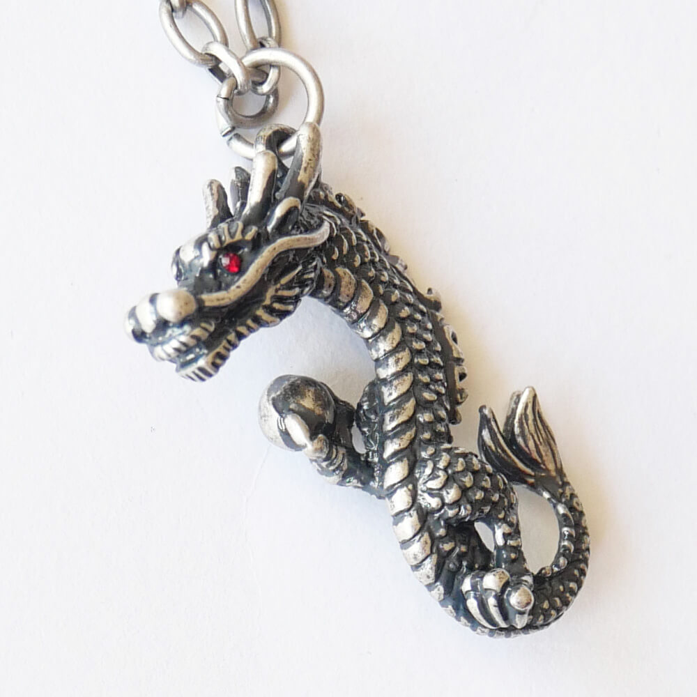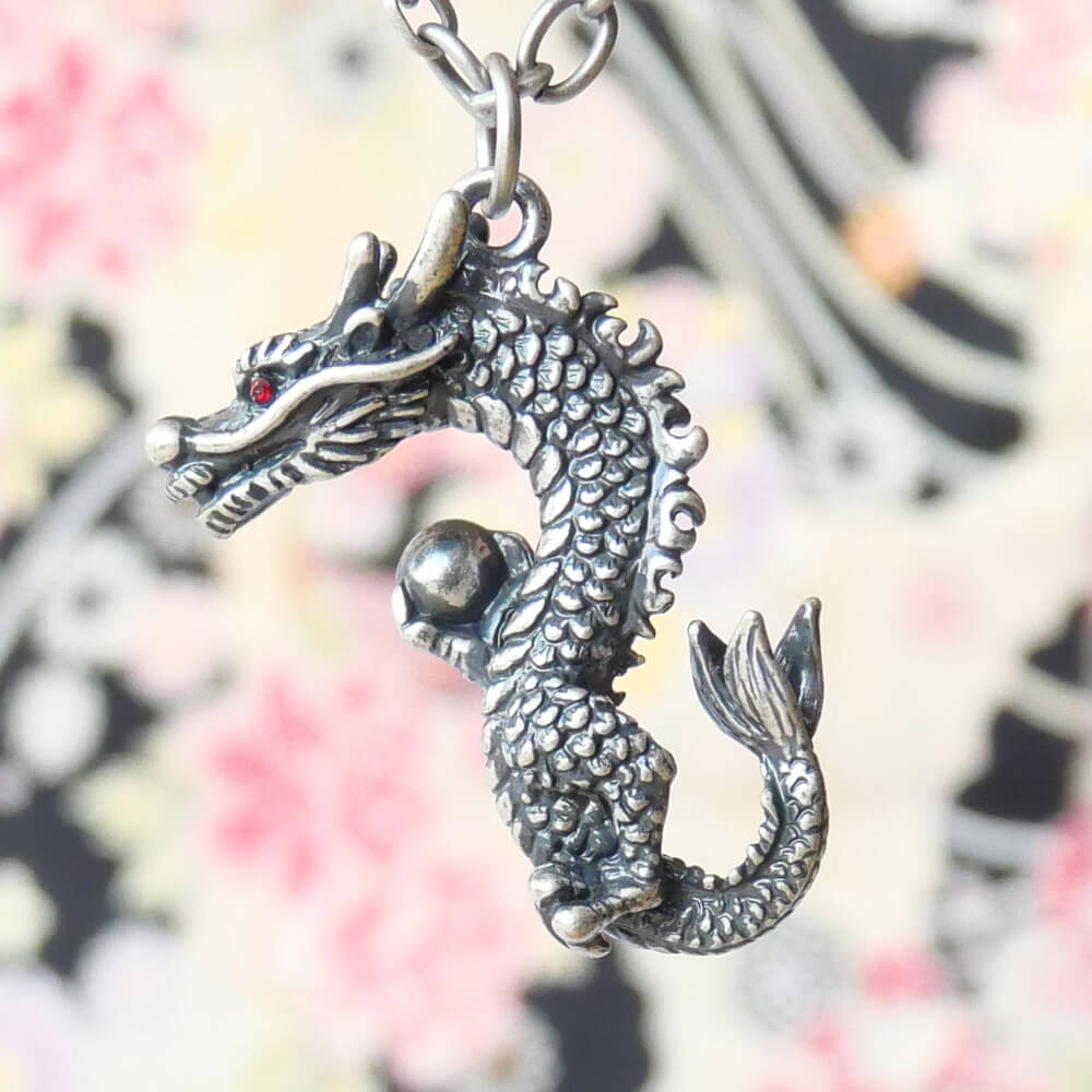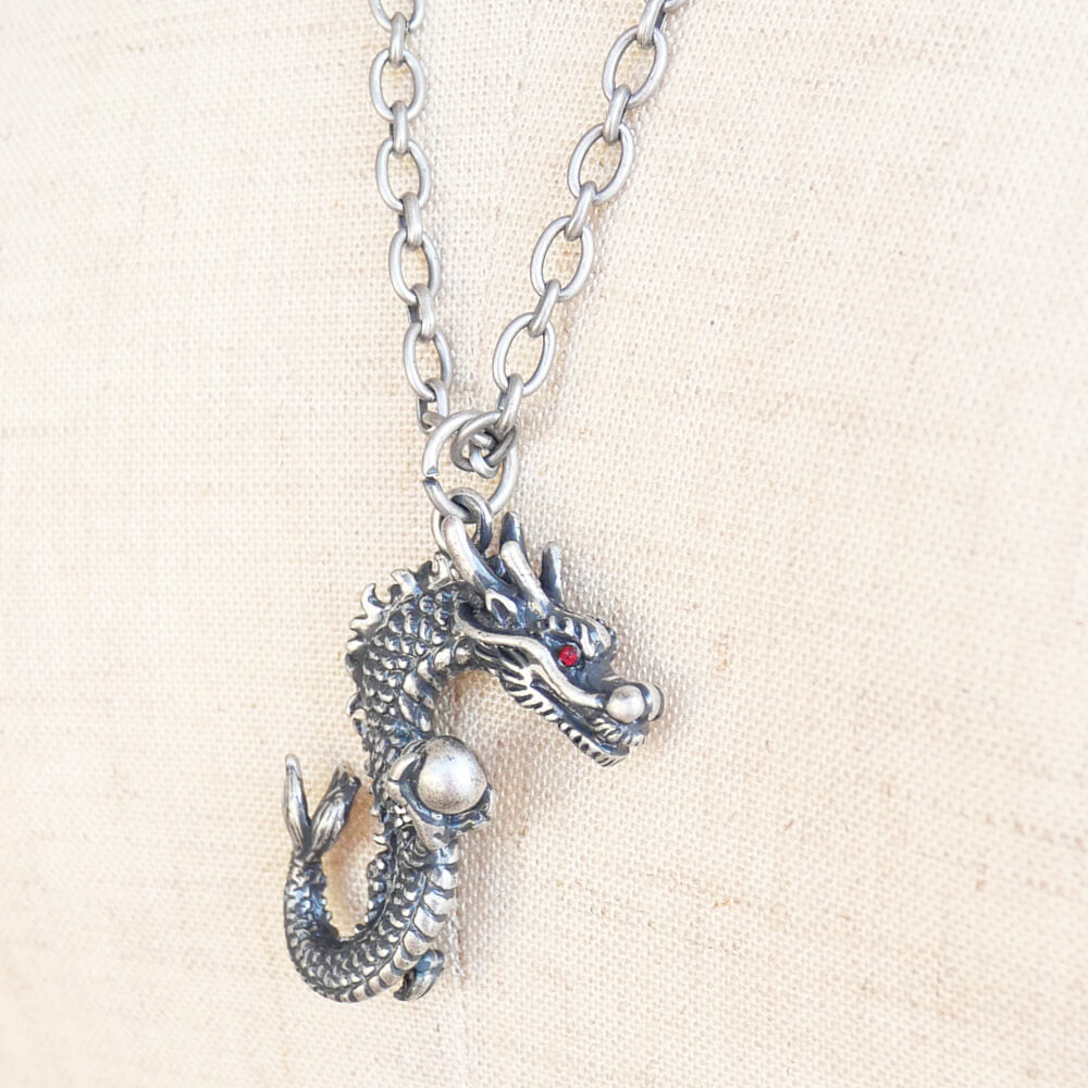 龍の目には鮮やかなレッドストーンがあしらわれ、存在感のあるアクセサリーに仕上がっています。