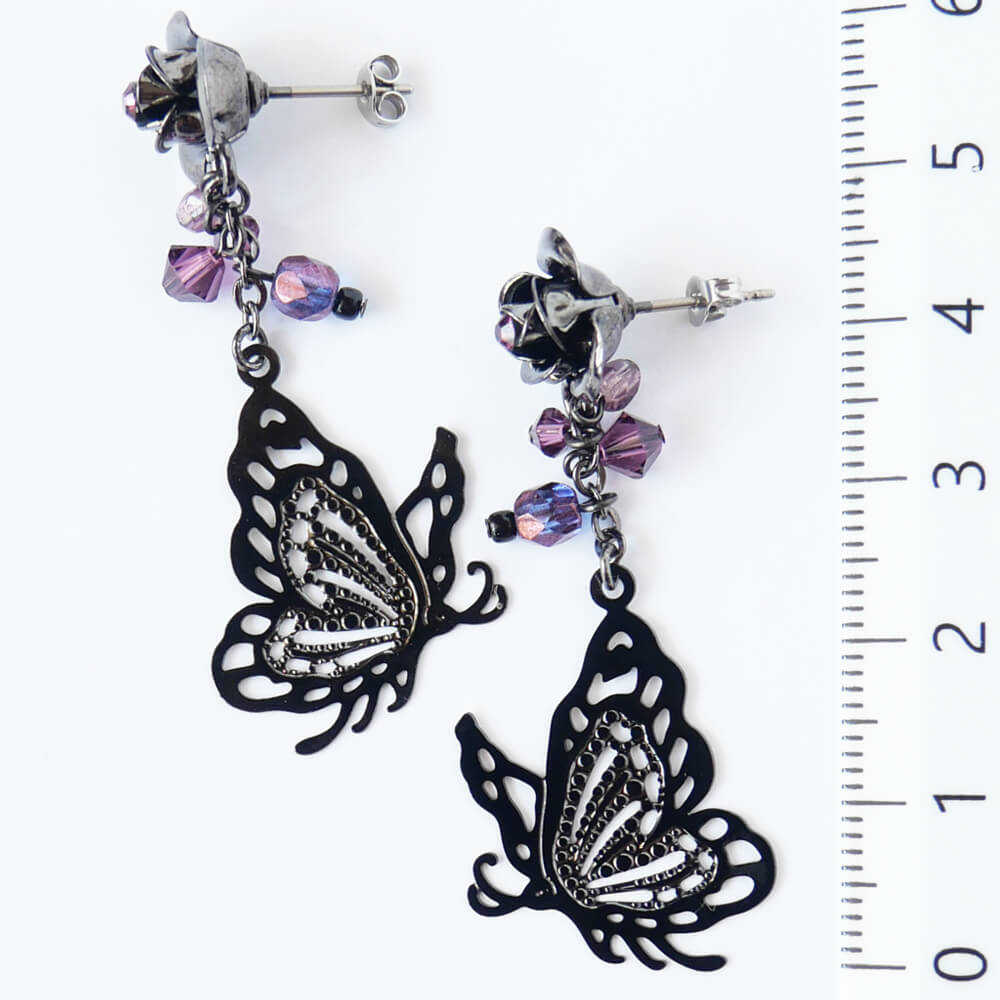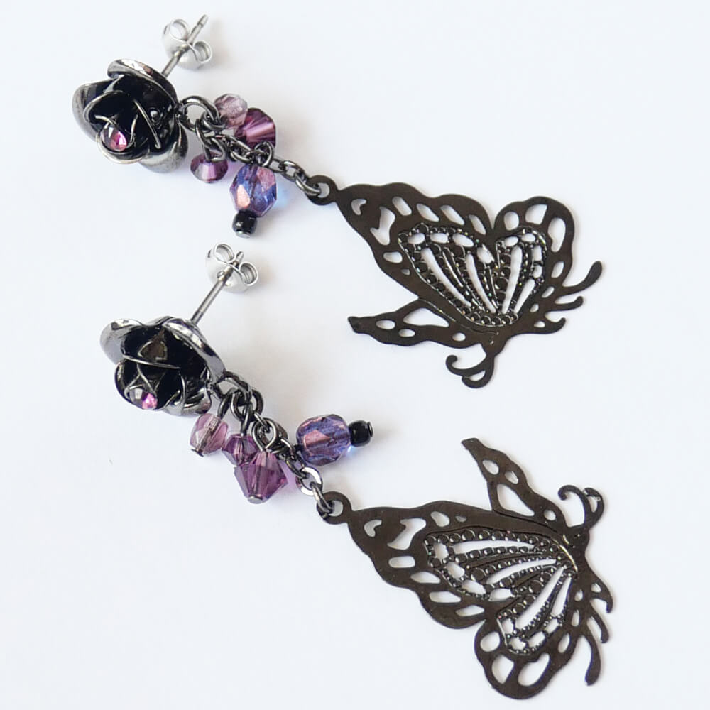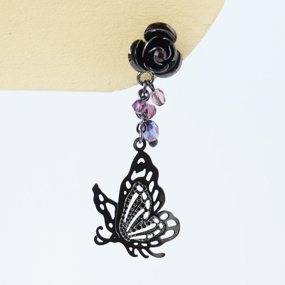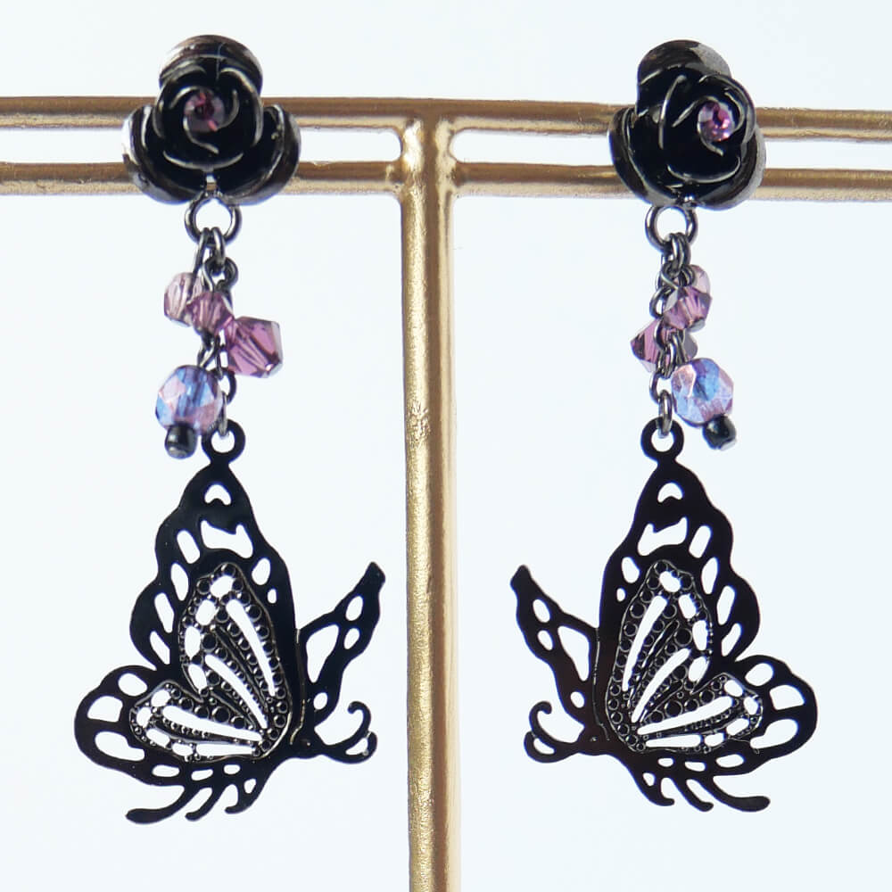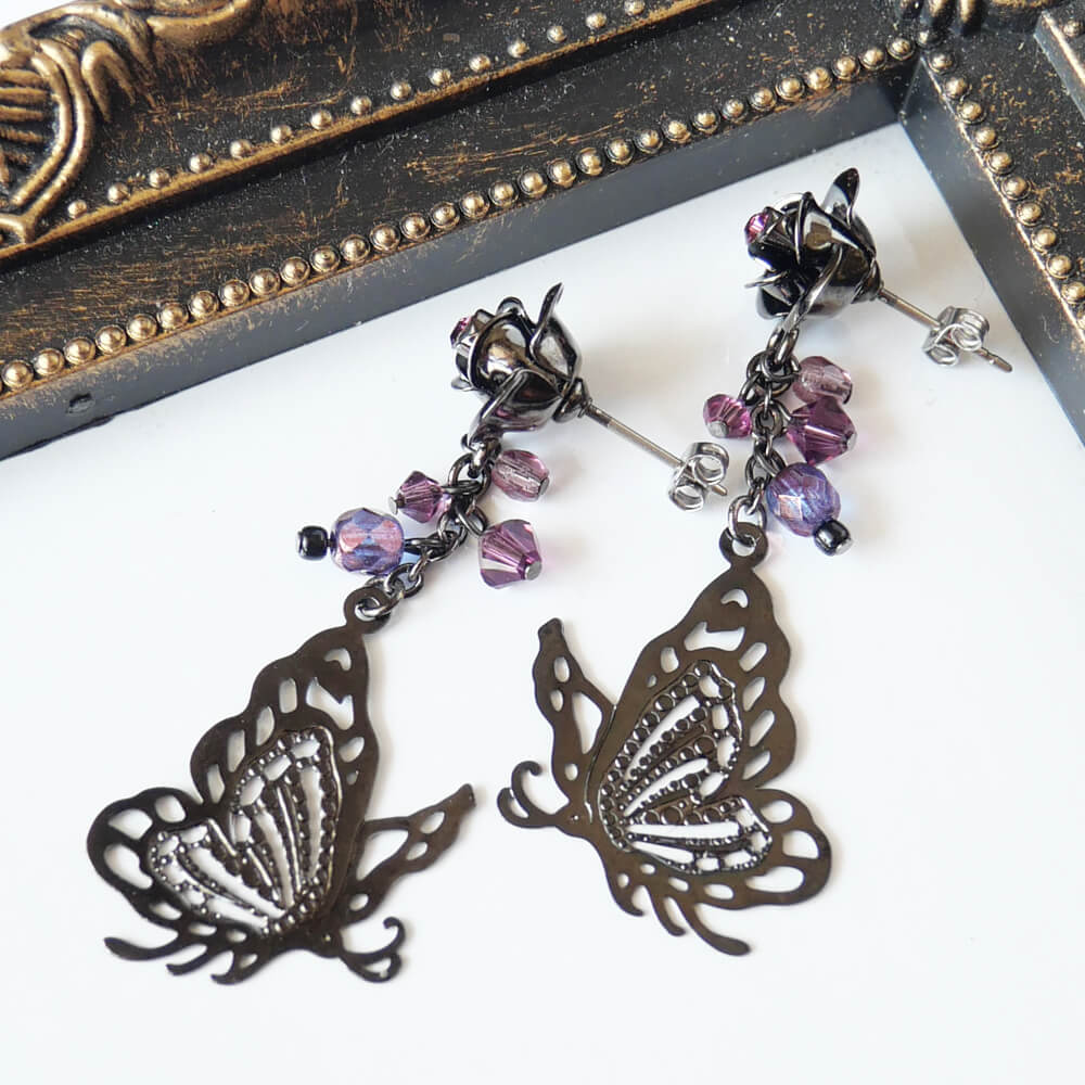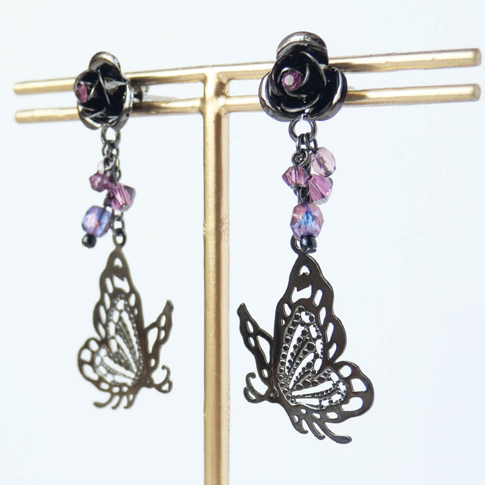 紫の薔薇と蝶が織りなす美しいデザインのピアス