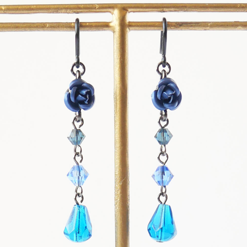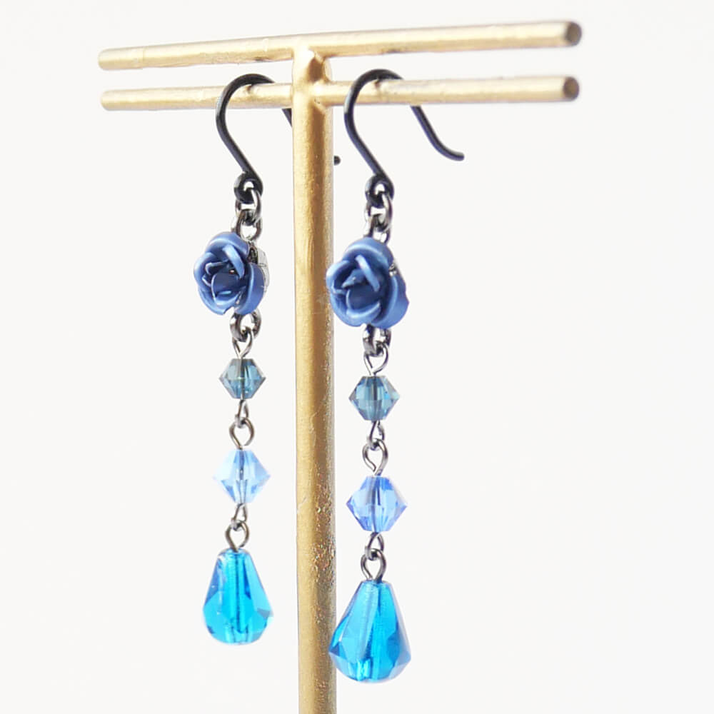 ブルーの薔薇が神秘的で小さな可愛いバラピアスです。