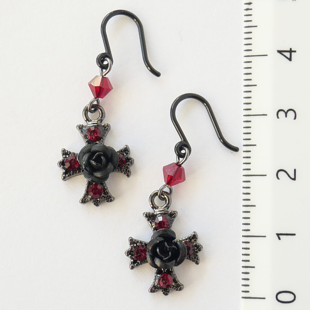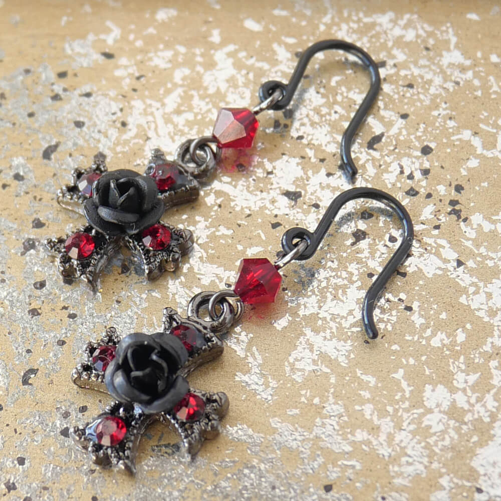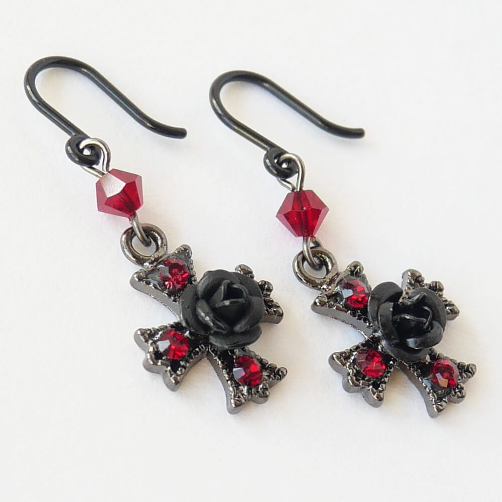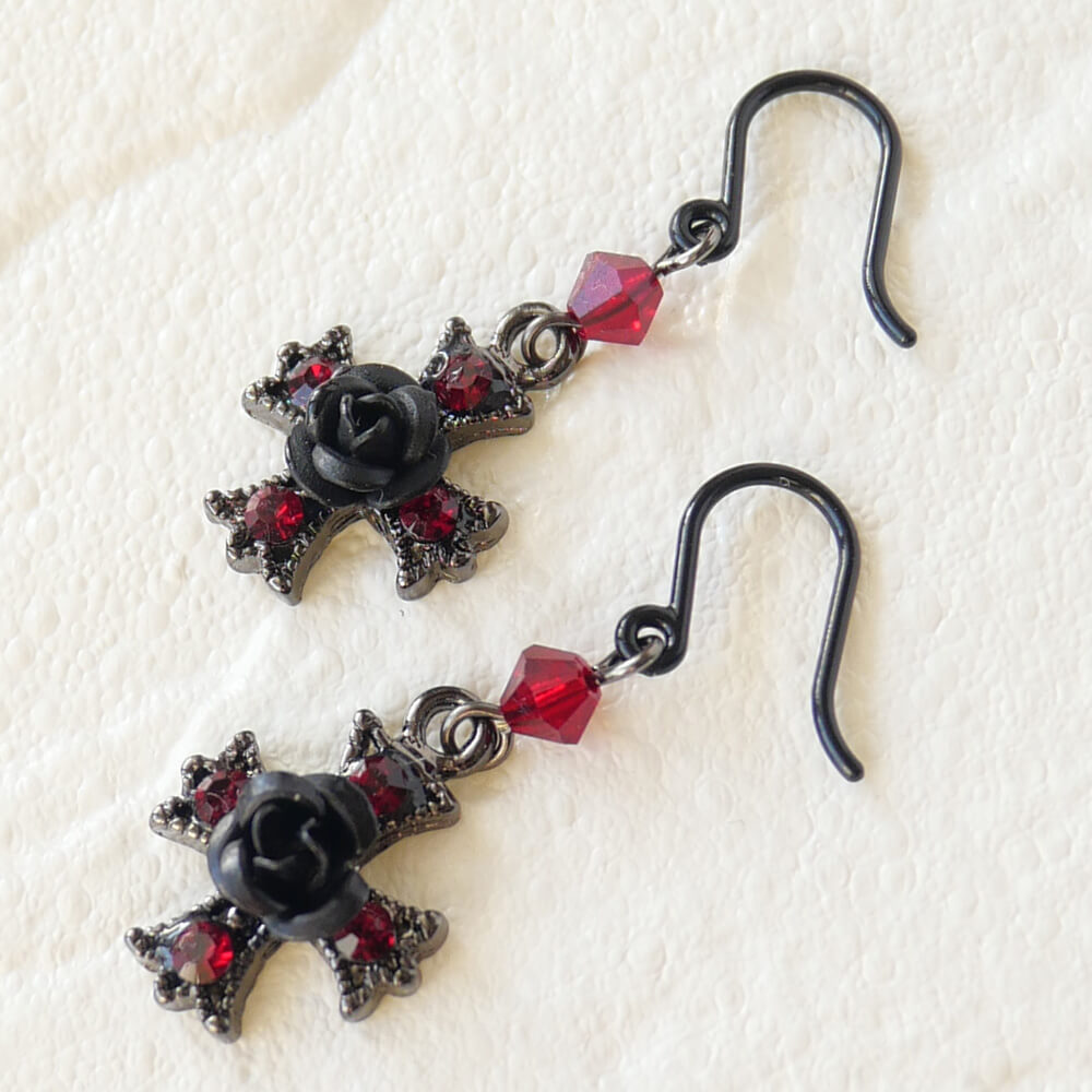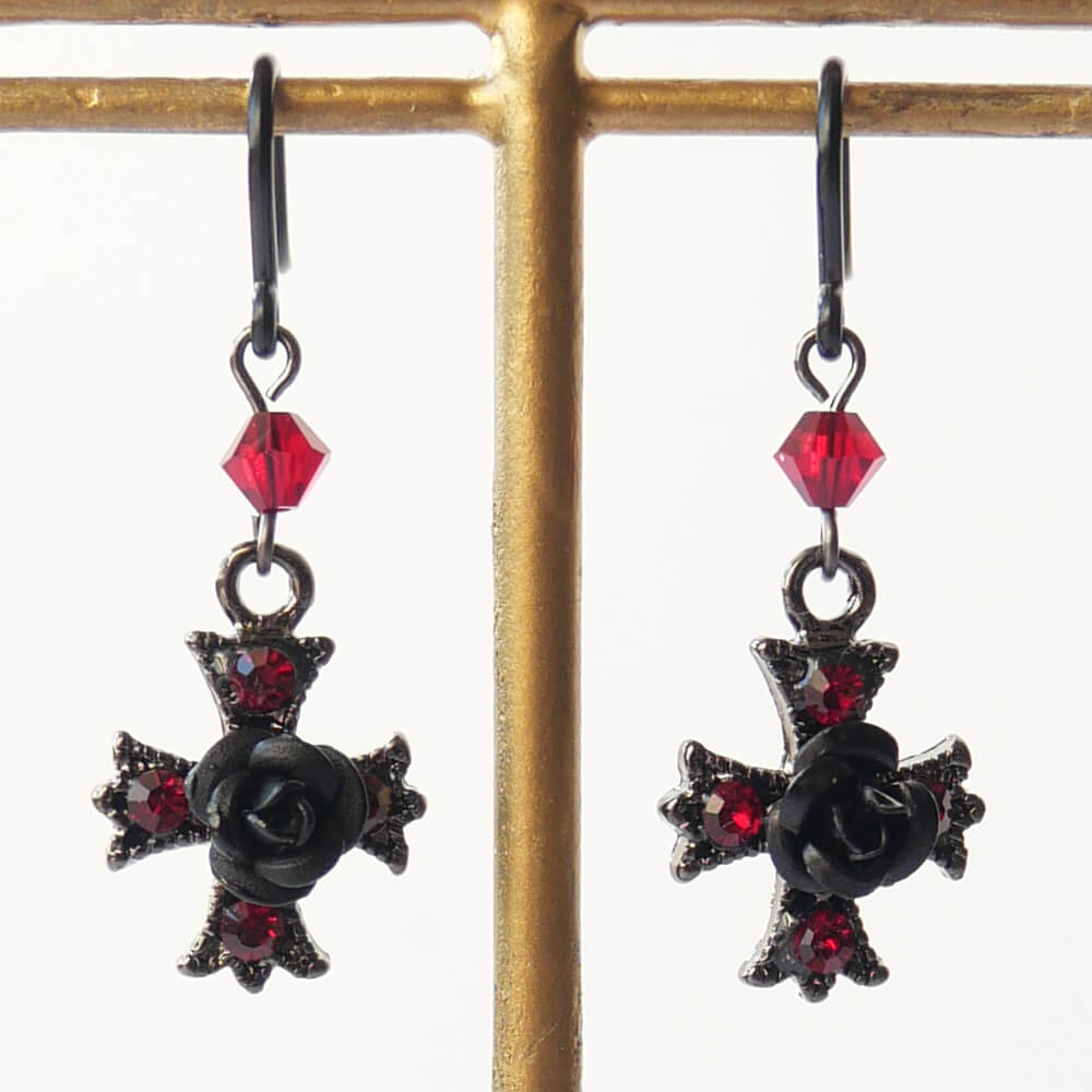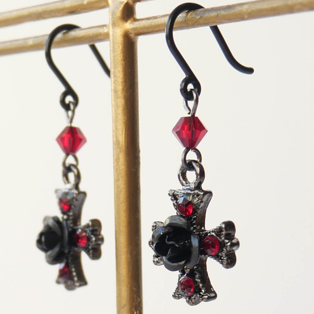 レッドストーン×ブラックローズがシックで洗練された印象を与えるゴス系ピアスです。