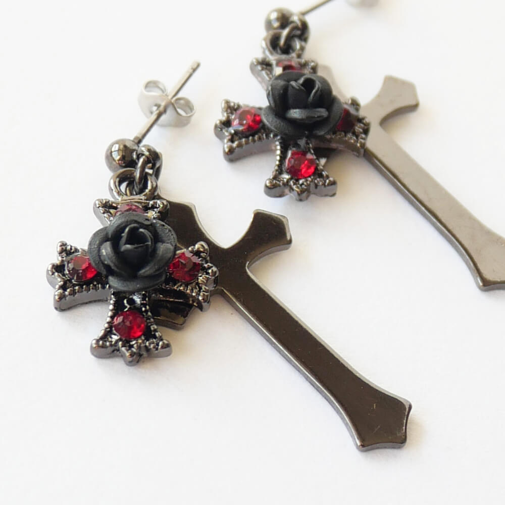 小さな十字パーツに4つの赤いストーン、中央に黒薔薇