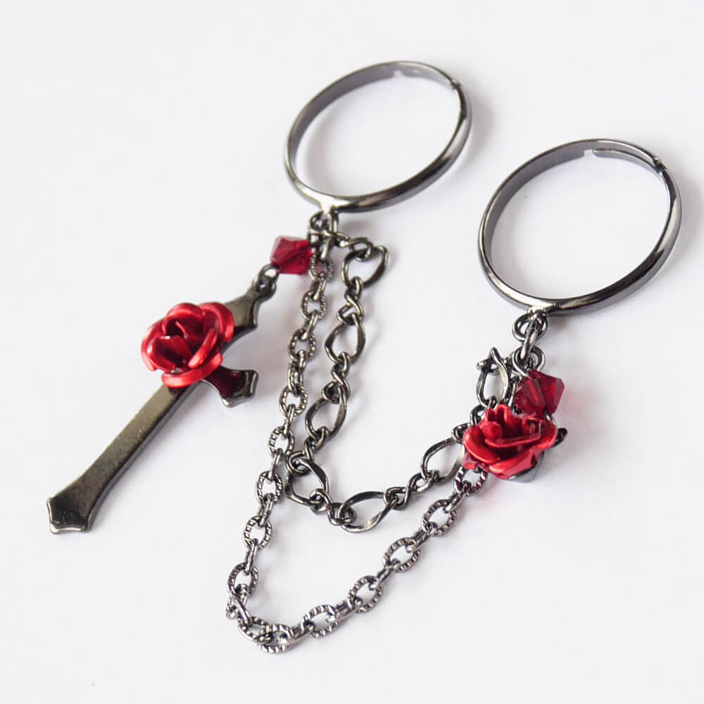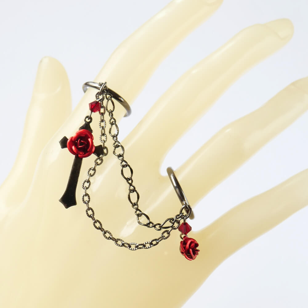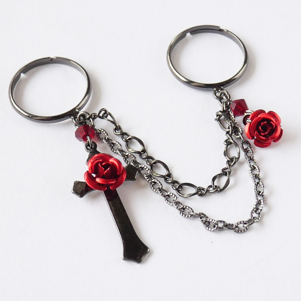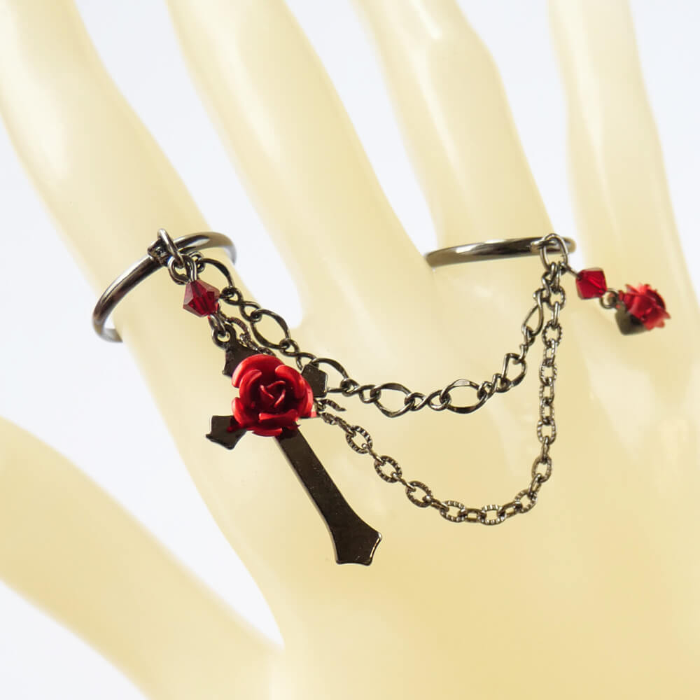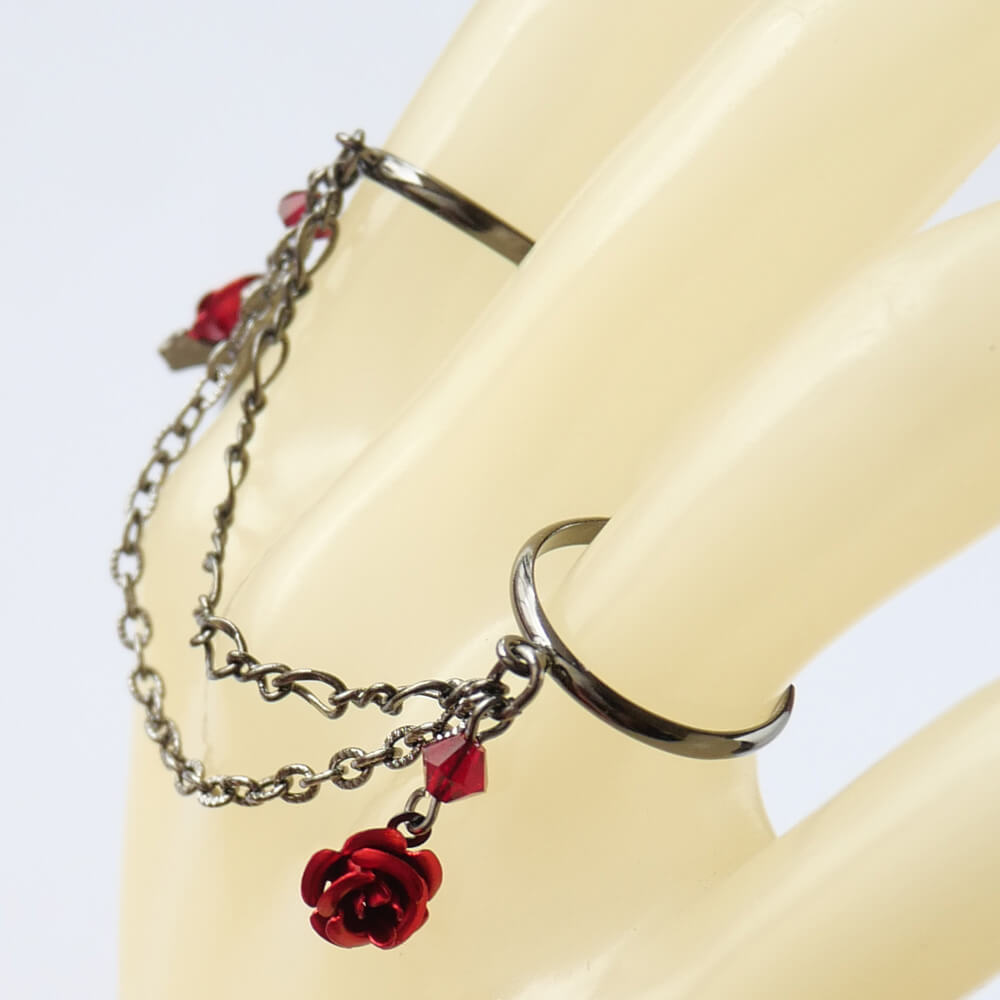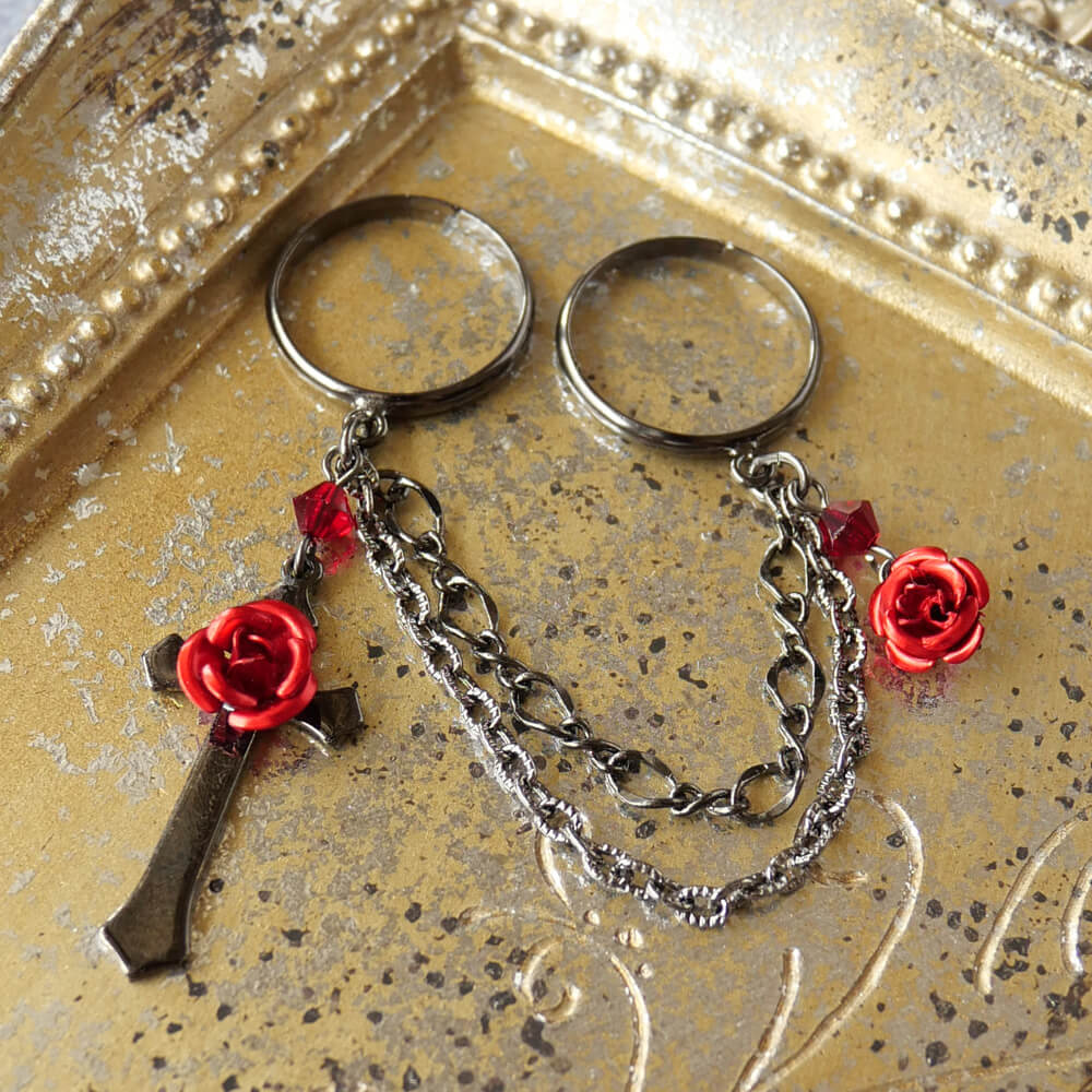 中央に赤薔薇のガンメタクロスと薔薇が2種類のチェーンでつながれたダブルリング