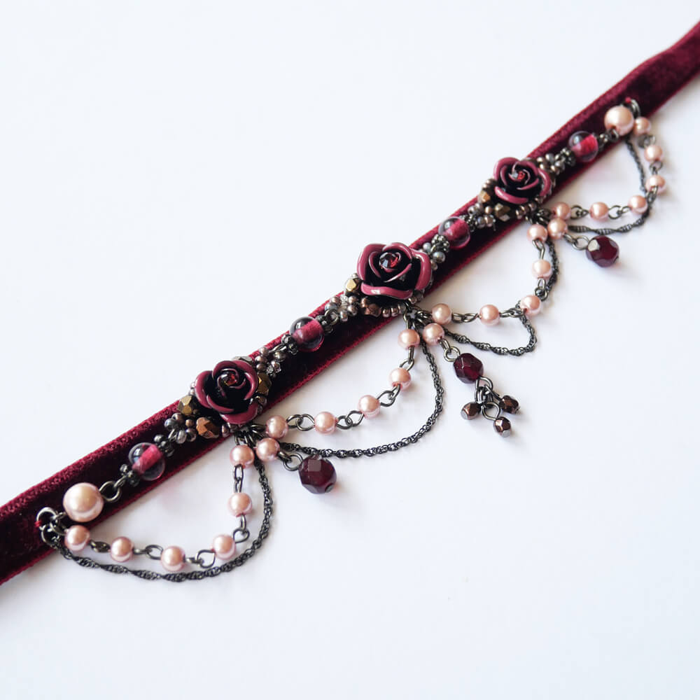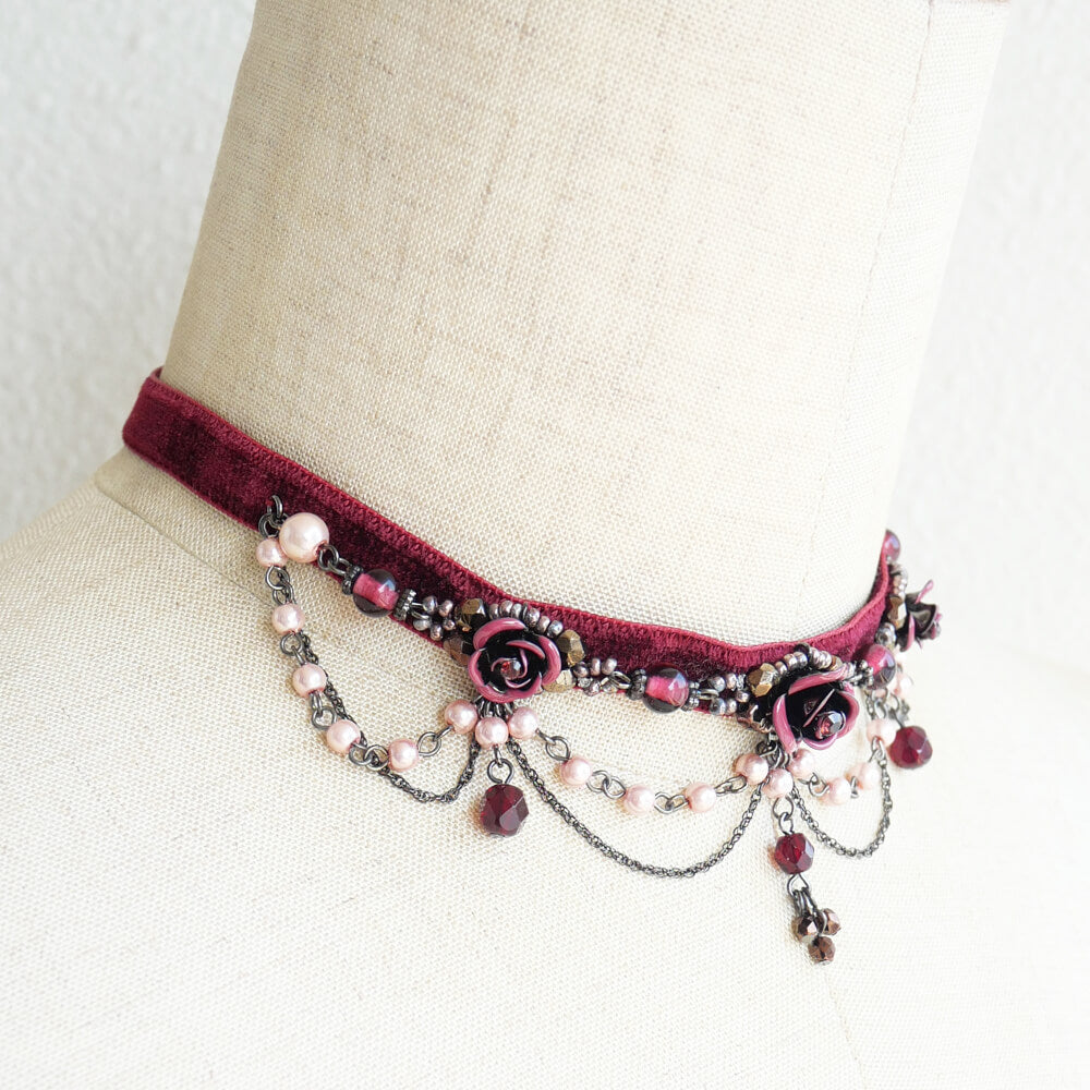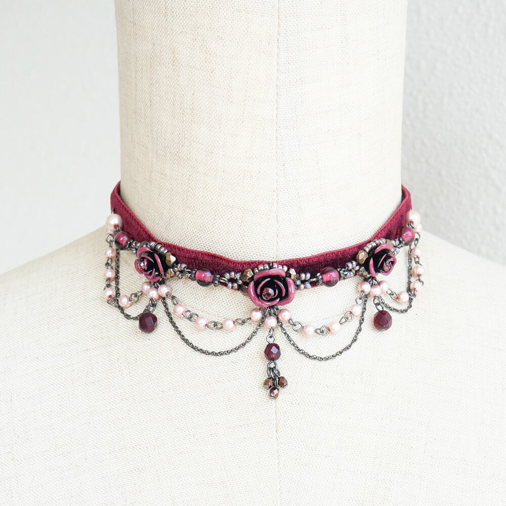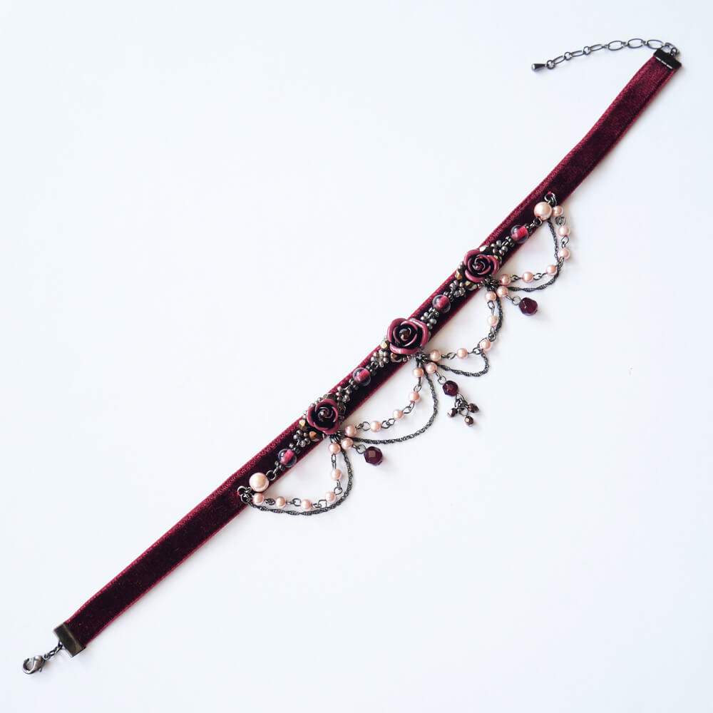 薔薇 ビーズ パール ゴシック ベルベット チョーカー ワイン