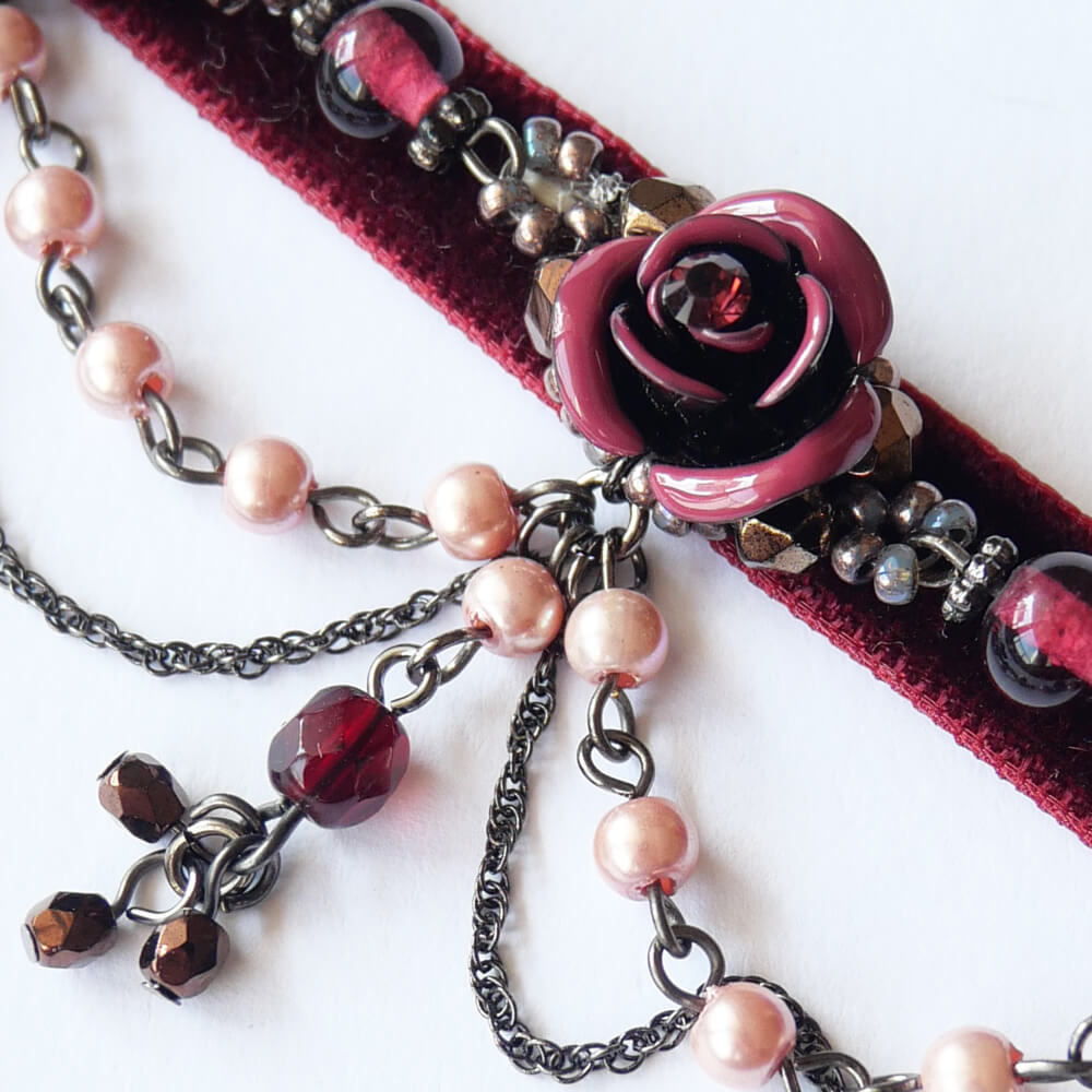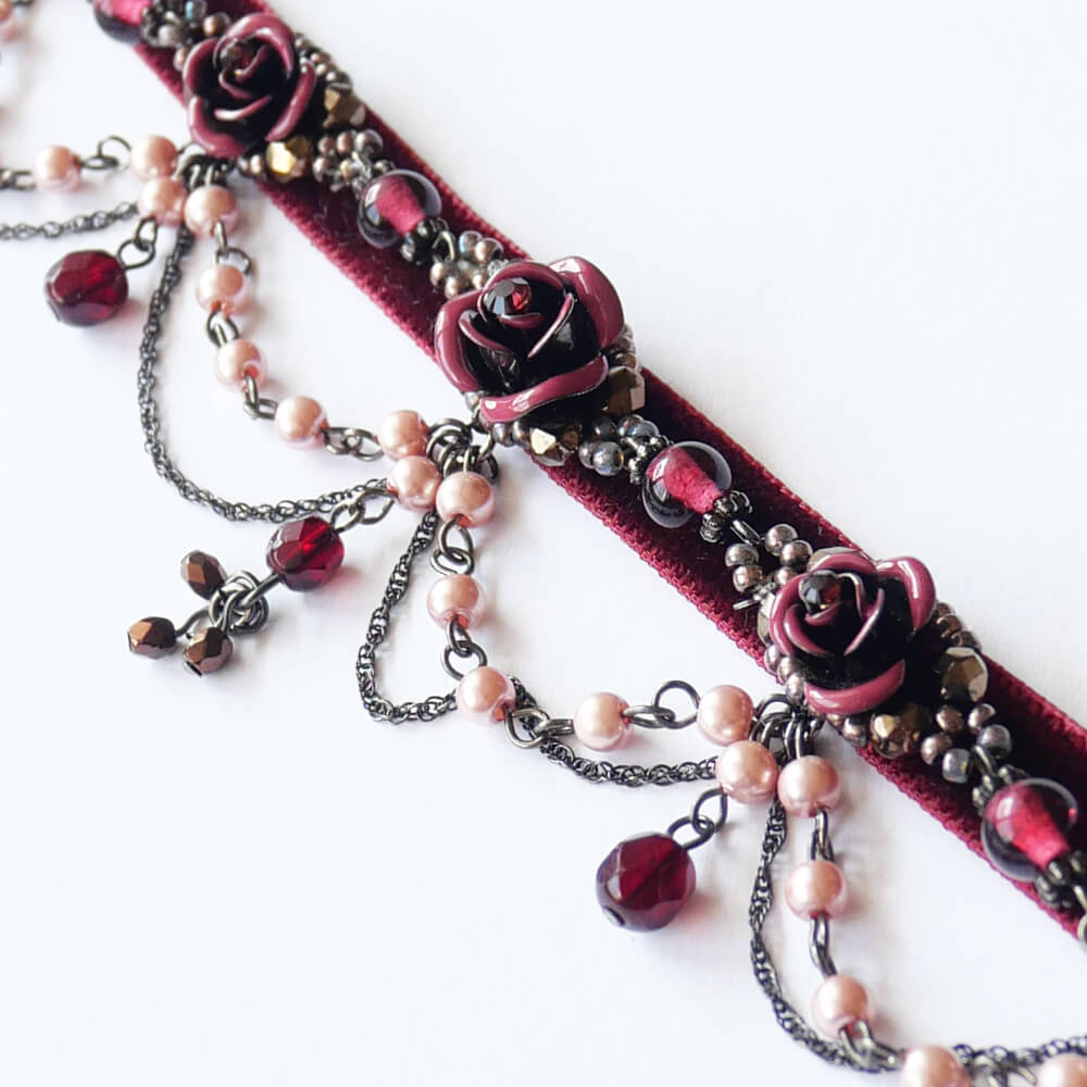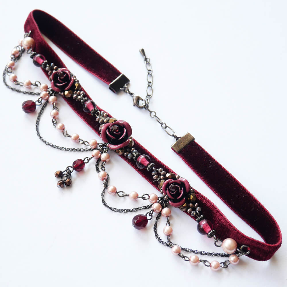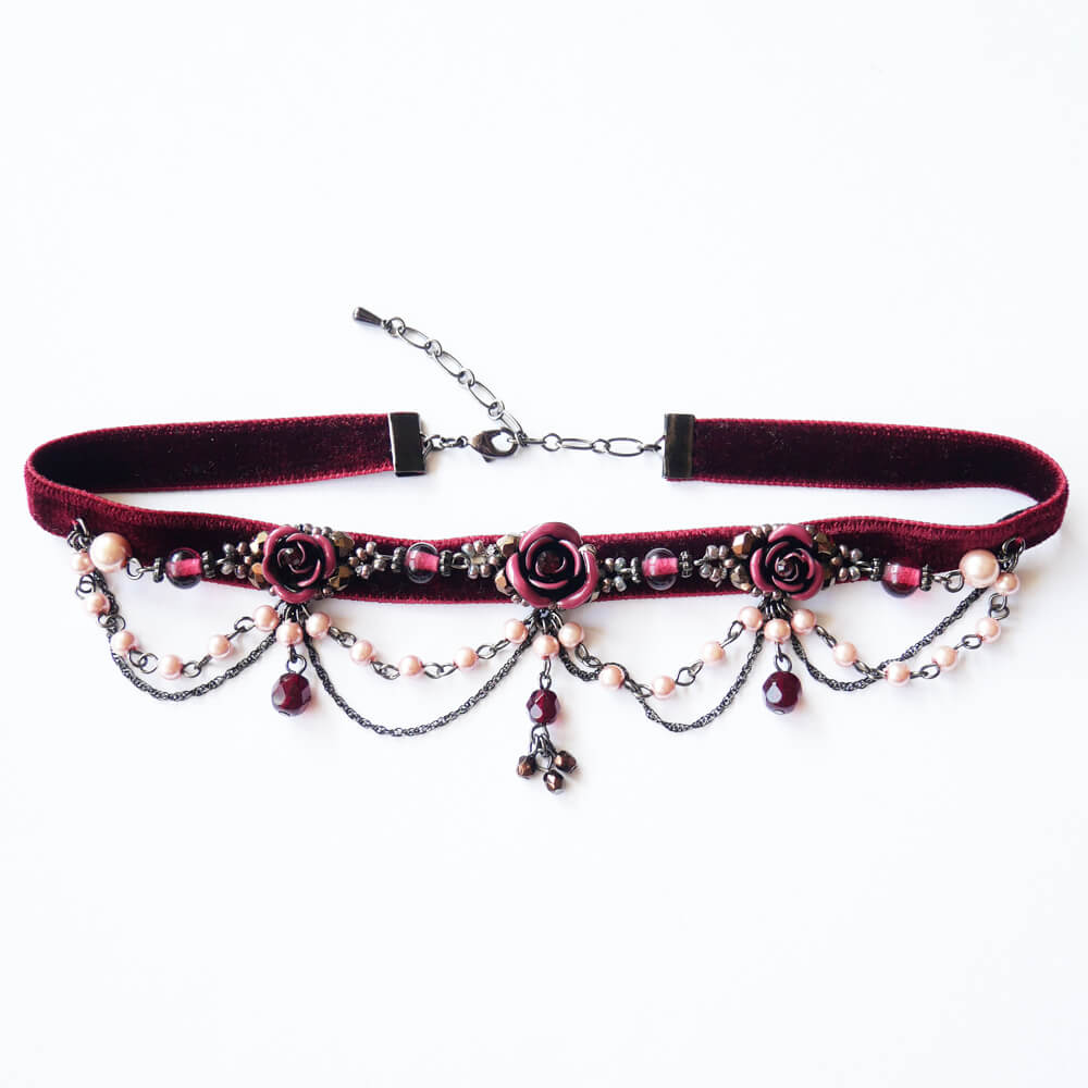 薔薇 ビーズ パール ゴシック ベルベット チョーカー ワイン