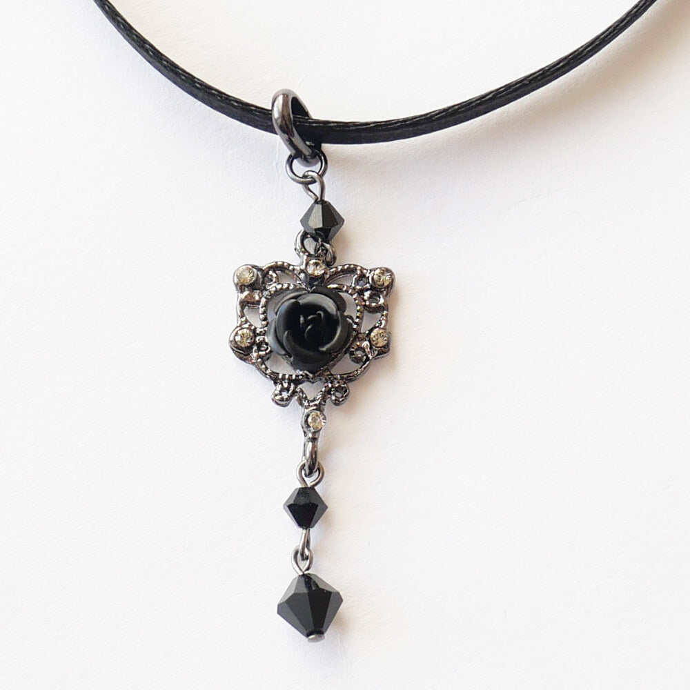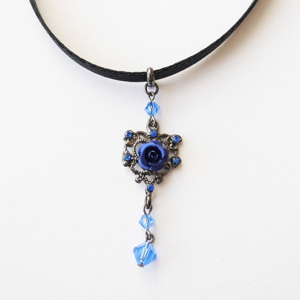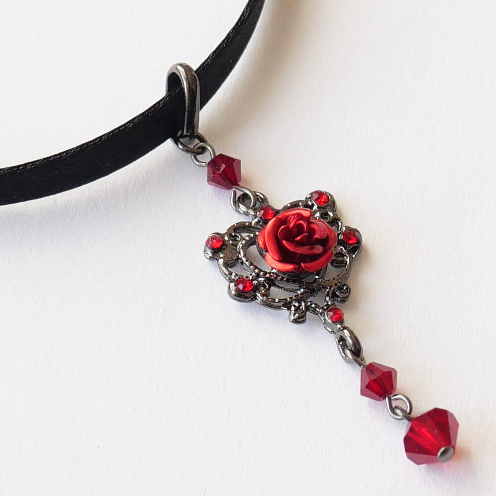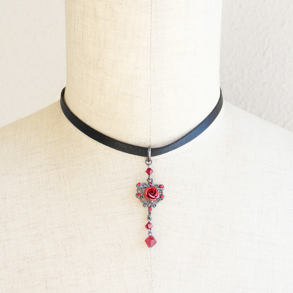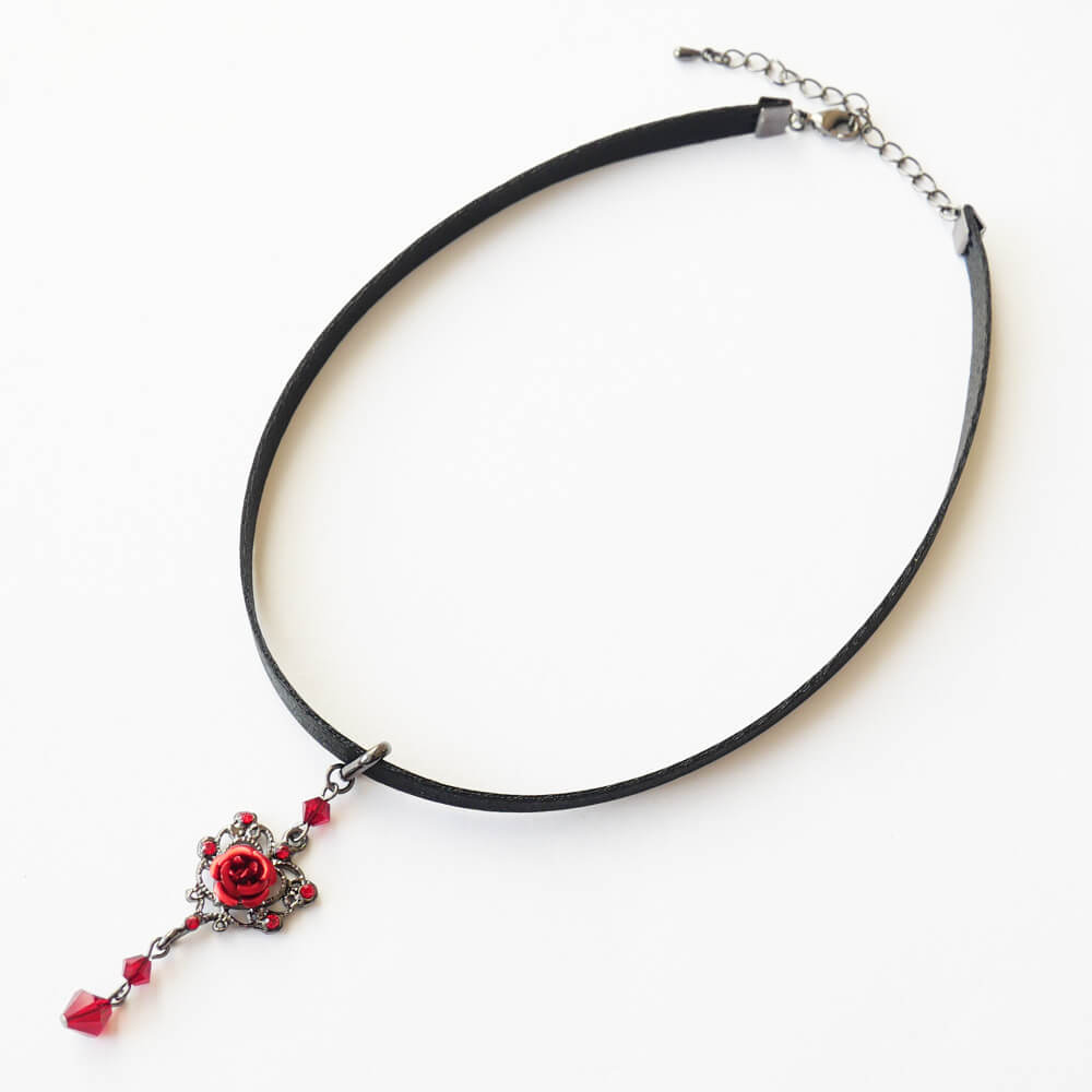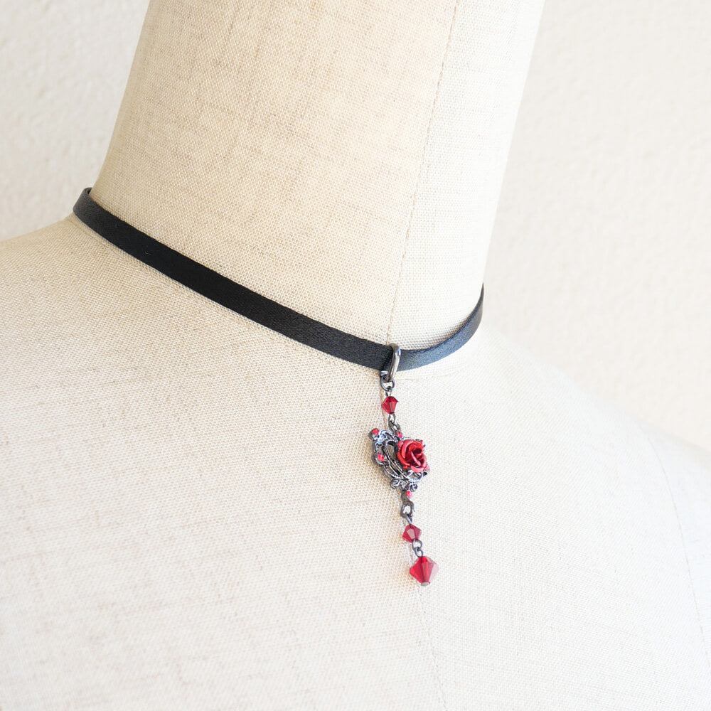 薔薇とハートのデザインが特徴のこのスリムチョーカーは、 カラーストーンが散りばめられたハートに、同色の薔薇があしらわれ、ゴシックロリータスタイルお勧めのアクセサリー。