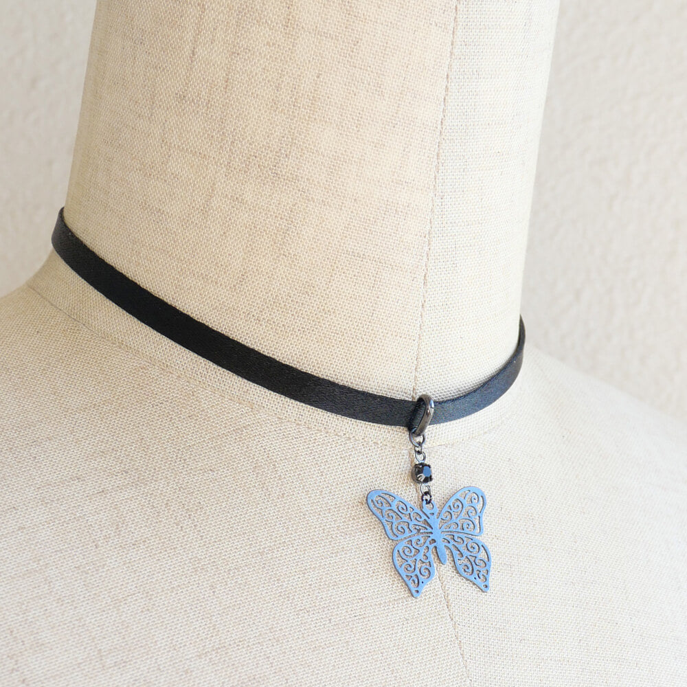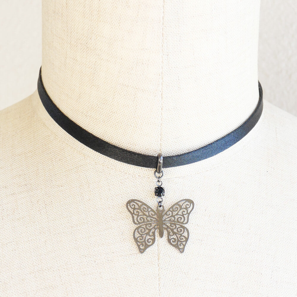 ステンド 蝶 ガンメタ サテン チョーカー 細め レディース
