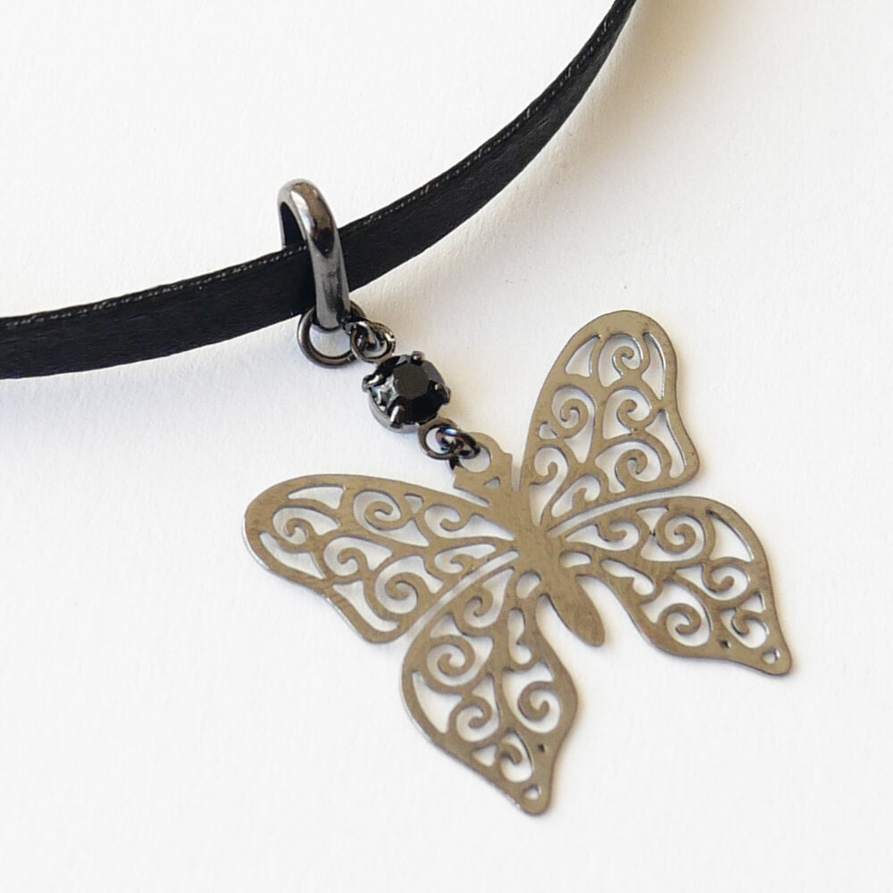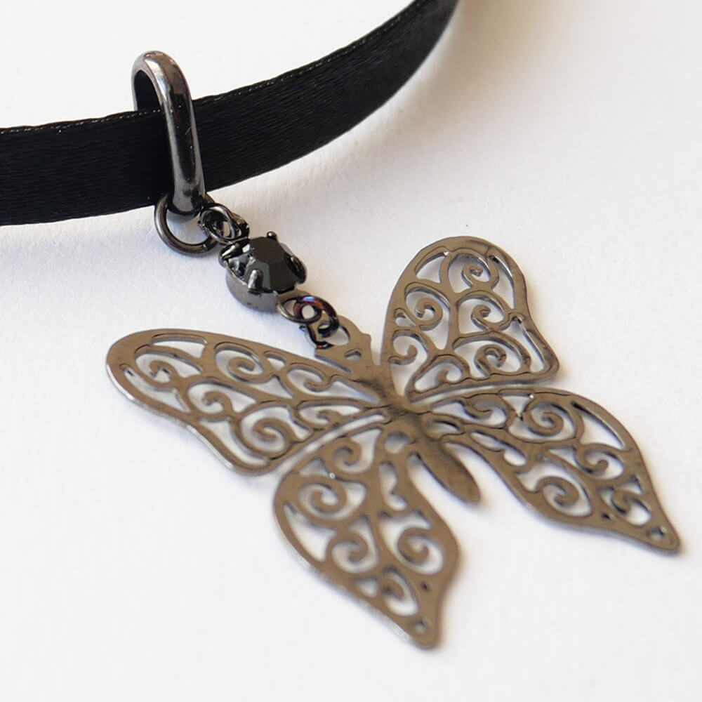 ゴシック感漂う繊細なステンド蝶パーツが特徴で、ガンメタ仕上げの黒蝶バタフライが、首元に洗練された印象を与えます。