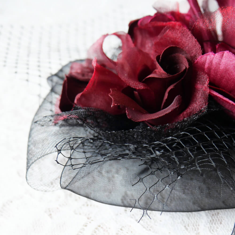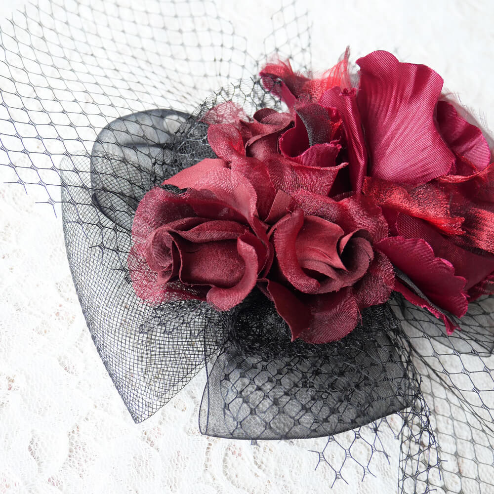 ワインレッドのコサージュとフラワーブーケタイプのデザインが特徴のフラワーアクセサリー