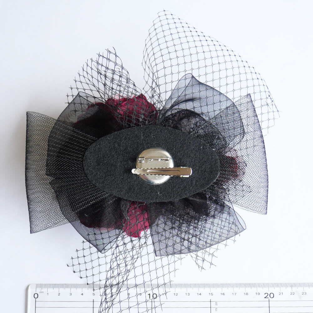 黒系のネット、柔らかなオーガンジー、網チュールを重ねてハンドメイド